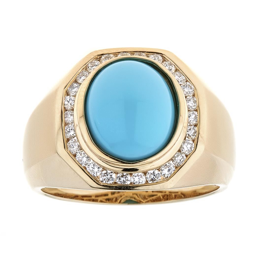 One Turquoise and Diamond Ring. Setting: 14 Kt. yellow Gold Mounting. Additional: 26 Round Diamonds = 0.55 Cts. TWT (G-H/VS-SI). Center Gem Stone Information: Species: natural turquoise. Variety: turquoise. Shape and Cut: cabochon. Measurements: 12.70 x 10.65 x 4.50 mm. Weight: 2.95 Carats. Transparency: opaque. Color Hue: Blue. Saturation: Moderate. Total Weight: 11 grams.