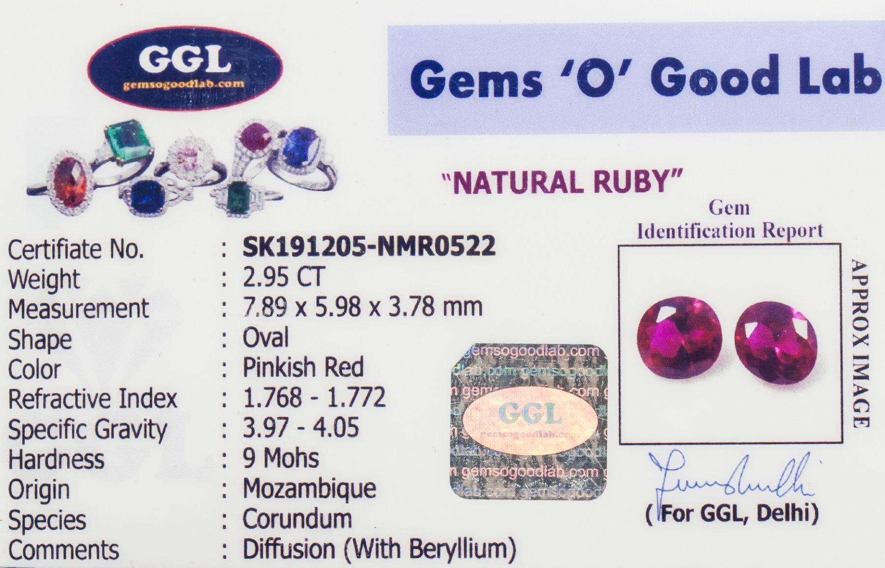 Two (1) 2.95 ct (total) oval cut pinkish red ruby gemstones. 7.89 x 5.98 x 3.78 mm. Accompanied with GGL certificate.