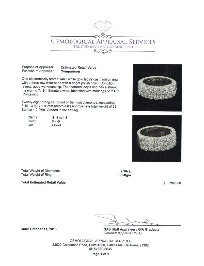 One electronically tested 14KT white gold lady's cast fashion ring with a three row wide band with a bright polish finish. The featured lady's ring has a shank measuring 7.19 millimeters wide. Identified with markings of '14K'. Condition is new, good workmanship. Containing: Twenty-Eight prong set round brilliant cut diamonds, measuring 3.10 - 3.00 x 1.86mm (depth est.) approximate total weight of 28 Stones = 2.96ct. Graded in the setting. Clarity SI-1 to I-1. Color: F - G Cut Good. Total Weight of Diamonds 2.96ct.. Total Weight of Ring 9.50gm. GAS Appraised at $7,990.00.