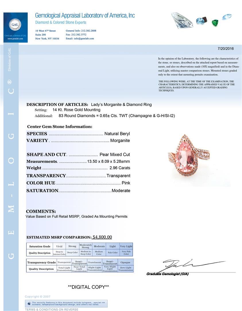 One lady's morganite and diamond ring. Setting: 14KT rose gold mounting. Additional: 83 round diamonds = 0.65cts. TWT (Champagne and G-H/SI-I2). Center gem stone information; species: natural beryl. Variety: morganite. Shape and cut: pear mixed cut. Measurements: 13.50 x 8.09 x 5.28mm. Weight: 2.96 carats. Transparency: Transparent. Color hue: pink. Saturation: moderate. Total Weight: 3.59 grams.