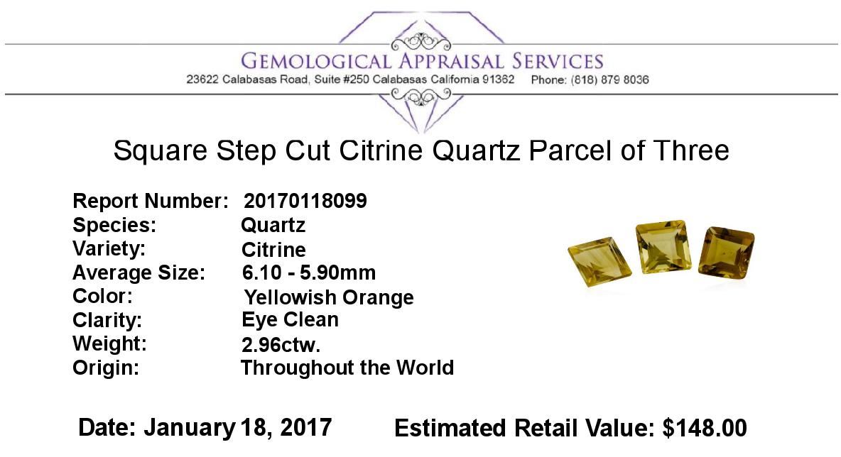 One natural square step cut citrine quartz parcel of three with an exact weight of 2.96ctw., clarity is eye clean, yellowish orange. Gemological Appraisals Services estimates the retail value at $148 GAS Appraised.