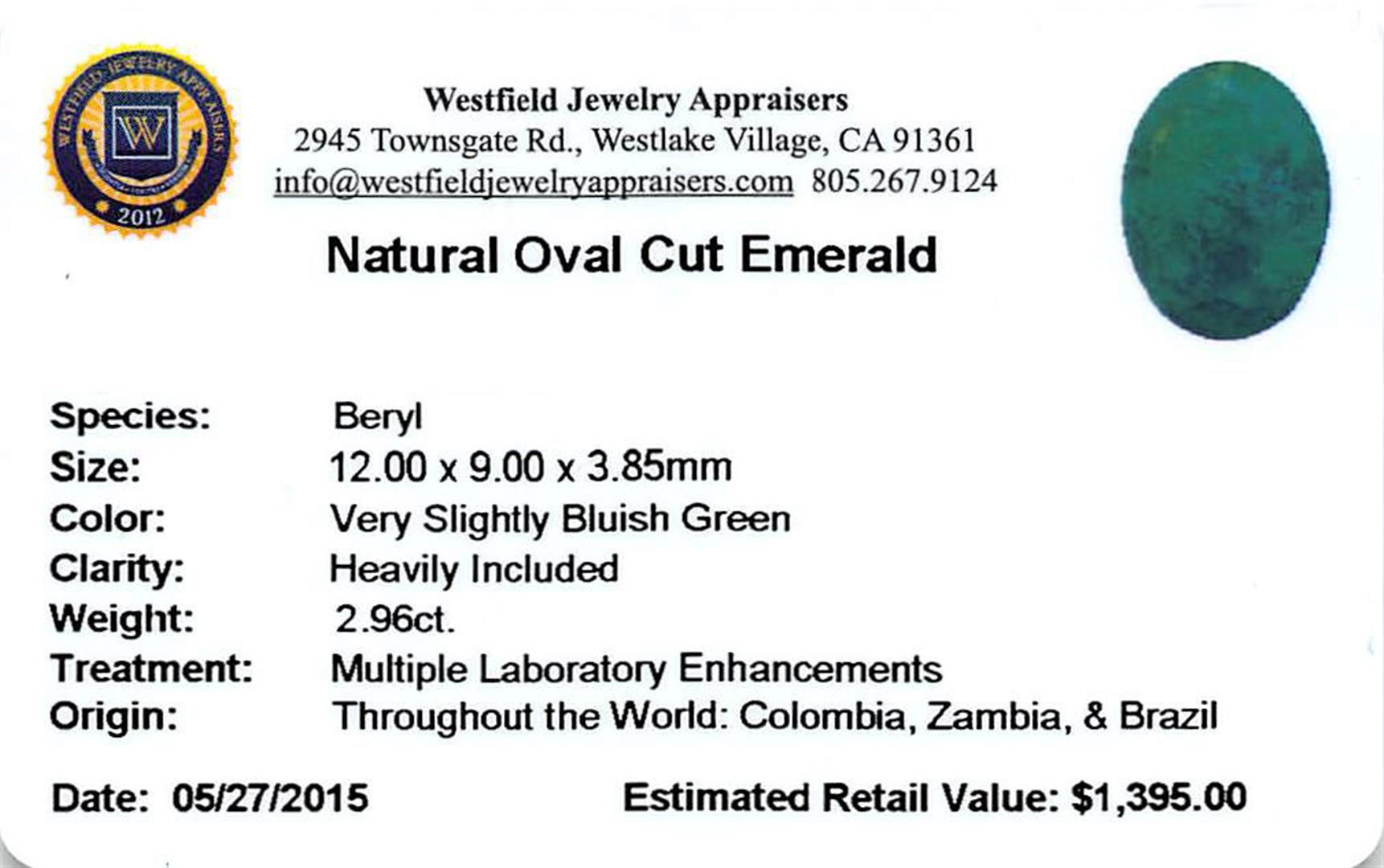 One prong set oval mixed cut natural emerald, measuring 12.00 x 9.00 x 3.85mm, exact total weight 2.96ct., clarity is heavily included, type III, medium dark, very slightly grayish, very slightly bluish green color, (GIA vslbG 6/3), cut is good. Transmitting light very diffusely, opaque. Naturally occurring internal & external characteristics are present. Indications of multiple laboratory enhancements, including high temperature heat treatment. Graded in the setting. Westfield Appraised at $1,395.00.