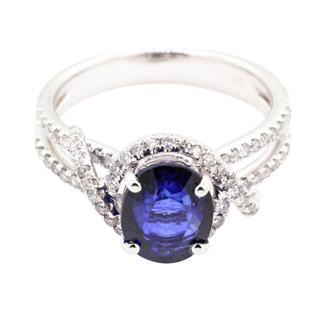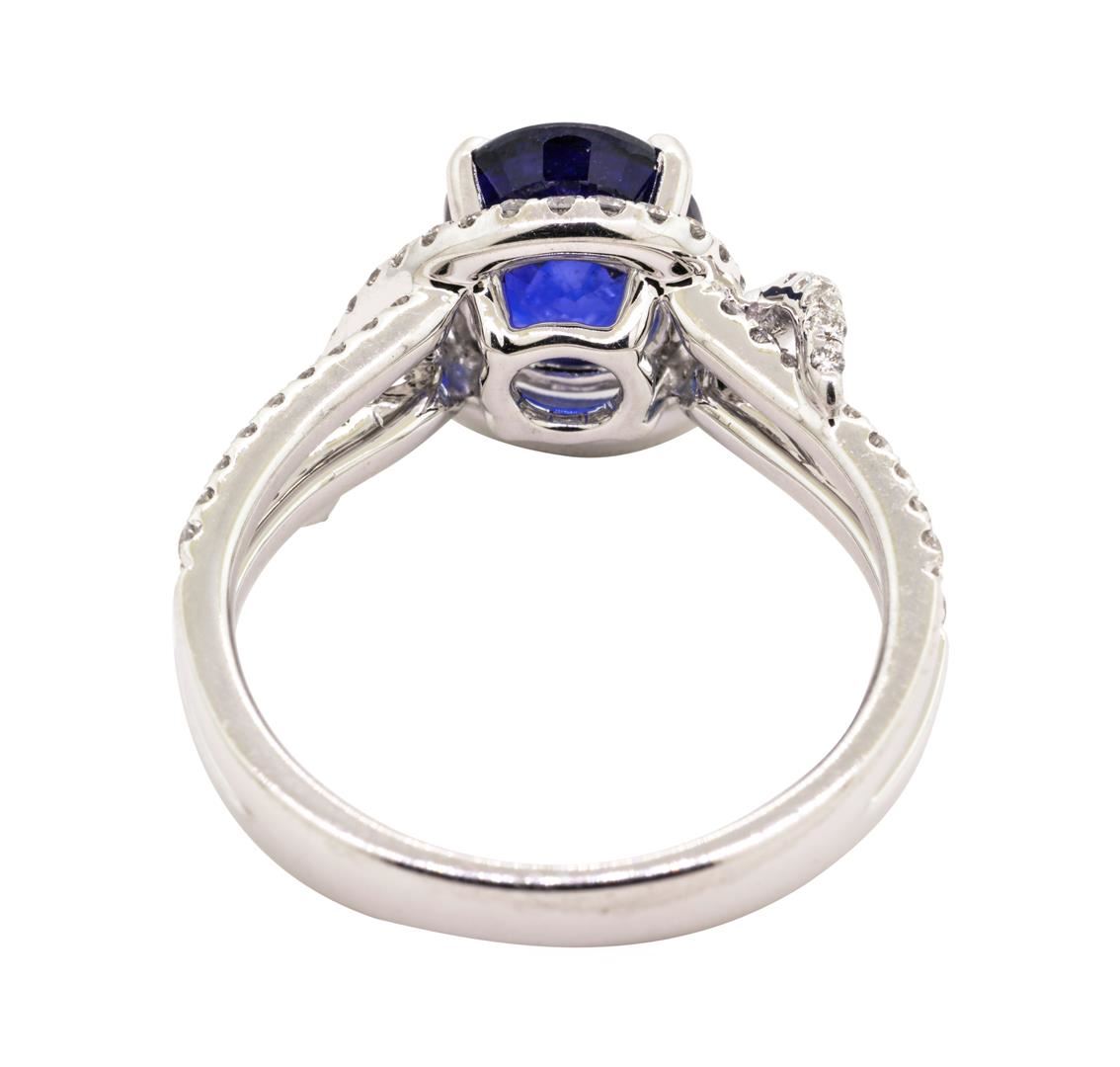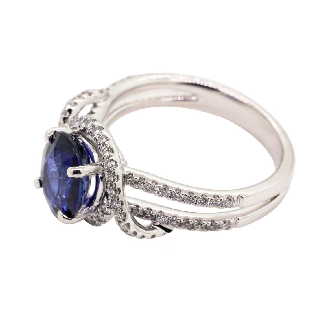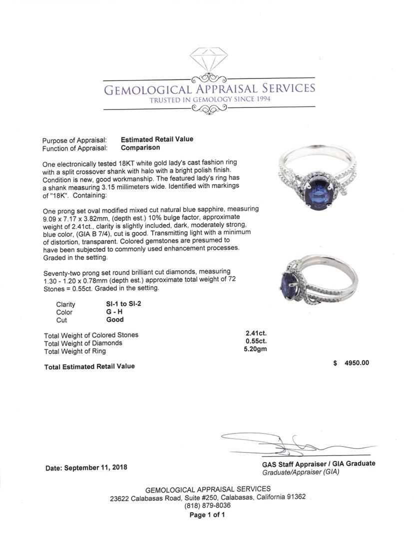 One electronically tested 18KT white gold lady's cast fashion ring with a split crossover shank with halo with a bright polish finish. The featured lady's ring has a shank measuring 3.15 millimeters wide. Identified with markings of '18K'. Condition is new, good workmanship. Containing: One prong set oval modified mixed cut natural blue sapphire, measuring 9.09 x 7.17 x 3.82mm, (depth est.) 10%. bulge factor, approximate weight of 2.41ct., clarity is slightly included, dark, moderately strong, blue color, (GIA B 7/4), cut is good. Transmitting light with a minimum of distortion, transparent. Colored gemstones are presumed to have been subjected to commonly used enhancement processes. Graded in the setting. Seventy-Two prong set round brilliant cut diamonds, measuring 1.30 - 1.20 x 0.78mm (depth est.) approximate total weight of 72 Stones = 0.55ct. Graded in the setting. Color G - H Clarity SI-1 to SI-2 Cut Good. Total Weight of Colored Stones 2.41ct.. Total Weight of Diamonds 0.55ct.. Total Weight of Ring 5.20gm GAS Appraised at $4950.00. GAS Appraised at $4,950.00.