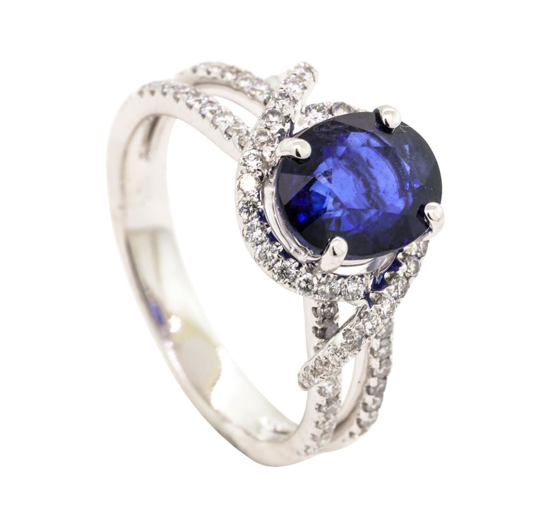 One electronically tested 18KT white gold lady's cast fashion ring with a split crossover shank with halo with a bright polish finish. The featured lady's ring has a shank measuring 3.15 millimeters wide. Identified with markings of '18K'. Condition is new, good workmanship. Containing: One prong set oval modified mixed cut natural blue sapphire, measuring 9.09 x 7.17 x 3.82mm, (depth est.) 10%. bulge factor, approximate weight of 2.41ct., clarity is slightly included, dark, moderately strong, blue color, (GIA B 7/4), cut is good. Transmitting light with a minimum of distortion, transparent. Colored gemstones are presumed to have been subjected to commonly used enhancement processes. Graded in the setting. Seventy-Two prong set round brilliant cut diamonds, measuring 1.30 - 1.20 x 0.78mm (depth est.) approximate total weight of 72 Stones = 0.55ct. Graded in the setting. Color G - H Clarity SI-1 to SI-2 Cut Good. Total Weight of Colored Stones 2.41ct.. Total Weight of Diamonds 0.55ct.. Total Weight of Ring 5.20gm GAS Appraised at $4950.00. GAS Appraised at $4,950.00.