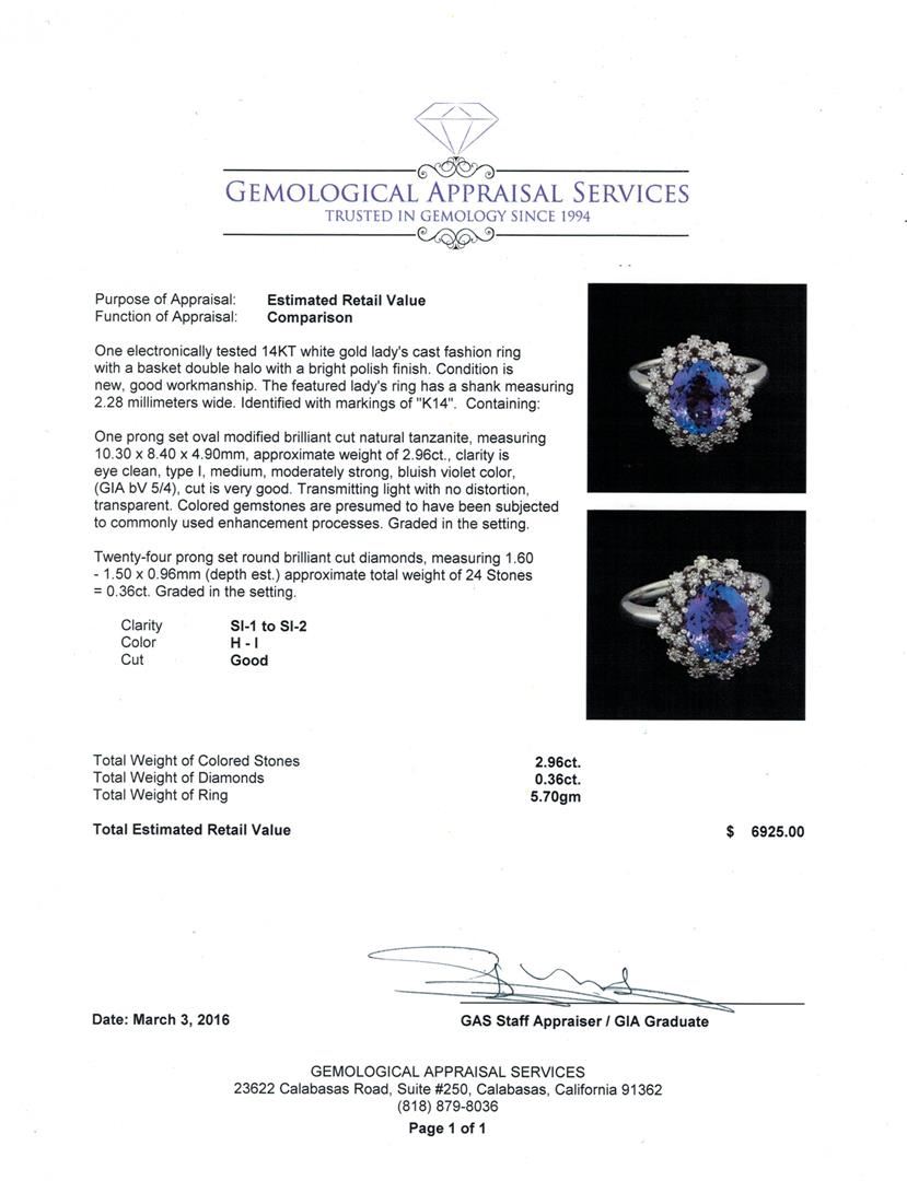One electronically tested 14KT white gold lady's cast fashion ring with a basket double halo with a bright polish finish. The featured lady's ring has a shank measuring 2.28 millimeters wide. Identified with markings of "K14". Condition is new, good workmanship. Containing: One prong set oval modified brilliant cut natural tanzanite, measuring 10.30 x 8.40 x 4.90mm, approximate weight of 2.96ct., clarity is eye clean, type I, medium, moderately strong, bluish violet color, (GIA bV 5/4), cut is very good. Transmitting light with no distortion, transparent. Colored gemstones are presumed to have been subjected to commonly used enhancement processes. Graded in the setting. Twenty-Four prong set round brilliant cut diamonds, measuring 1.60 - 1.50 x 0.96mm (depth est.) approximate total weight of 24 Stones = 0.36ct. Graded in the setting. Clarity: SI-1 to SI-2. Color: H - I. Cut Good. Total Weight of Colored Stones 2.96ct. Total Weight of Diamonds 0.36ct. Total Weight of Ring 5.70gm. GAS Appraised at $6,925.00.