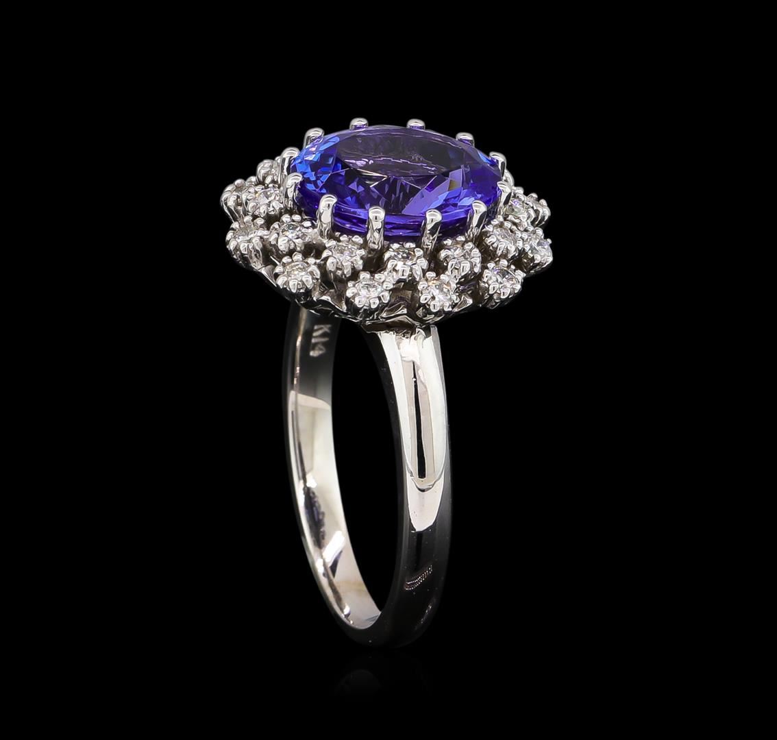 One electronically tested 14KT white gold lady's cast fashion ring with a basket double halo with a bright polish finish. The featured lady's ring has a shank measuring 2.28 millimeters wide. Identified with markings of "K14". Condition is new, good workmanship. Containing: One prong set oval modified brilliant cut natural tanzanite, measuring 10.30 x 8.40 x 4.90mm, approximate weight of 2.96ct., clarity is eye clean, type I, medium, moderately strong, bluish violet color, (GIA bV 5/4), cut is very good. Transmitting light with no distortion, transparent. Colored gemstones are presumed to have been subjected to commonly used enhancement processes. Graded in the setting. Twenty-Four prong set round brilliant cut diamonds, measuring 1.60 - 1.50 x 0.96mm (depth est.) approximate total weight of 24 Stones = 0.36ct. Graded in the setting. Clarity: SI-1 to SI-2. Color: H - I. Cut Good. Total Weight of Colored Stones 2.96ct. Total Weight of Diamonds 0.36ct. Total Weight of Ring 5.70gm. GAS Appraised at $6,925.00.