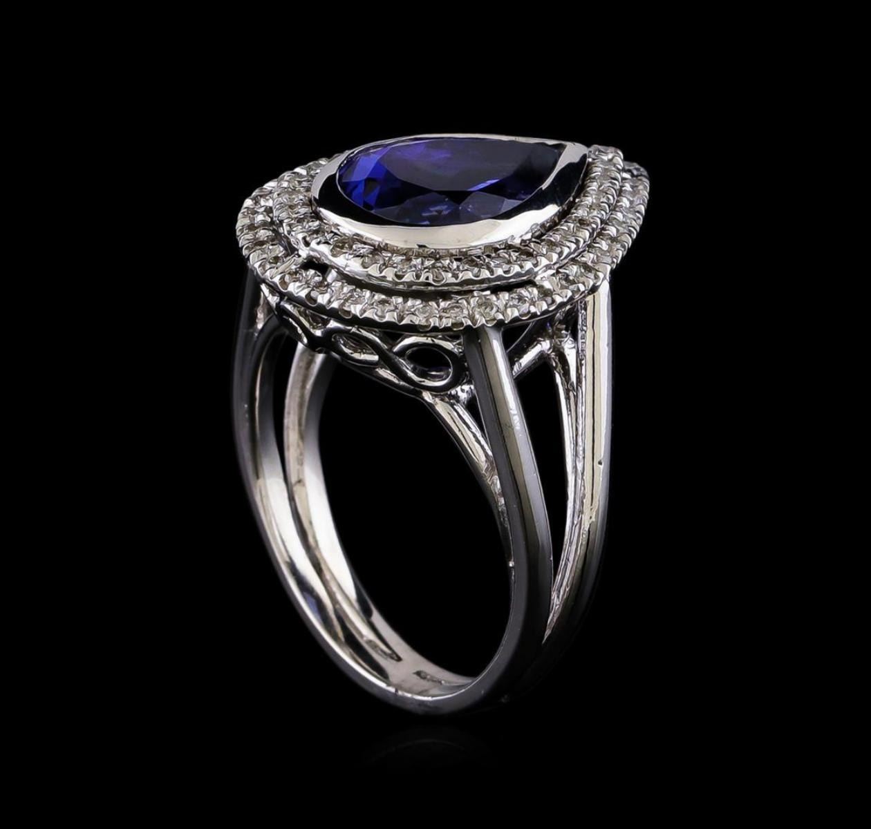 One electronically tested 14KT white gold lady's cast fashion ring with a split shank double basket halo with a bright polish finish. The featured lady's ring has a double shank measuring 3.17 millimeters in width. Identified with markings of "K14". Condition is new, good workmanship. Containing: One bezel set oval pear modified brilliant cut natural tanzanite, measuring 11.90 x 8.30 x 6.35mm, (depth est.) approximate weight of 2.96ct., clarity is eye clean, medium dark, very slightly grayish, bluish violet color, (GIA bV 6/3), cut is very good. Transmitting light with no distortion, transparent. Colored gemstones are presumed to have been subjected to commonly used enhancement processes. Graded in the setting. Sixty-Six prong set round brilliant cut diamonds, measuring 1.20 - 1.10 x 0.71mm (depth est.) approximate total weight of 66 Stones = 0.36ct. Graded in the setting. Clarity: SI-1 to SI-2. Color: H - I. Cut Good. Total Weight of Colored Stones 2.96ct. Total Weight of Diamonds 0.36ct. Total Weight of Ring 7.10gm. GAS Appraised.