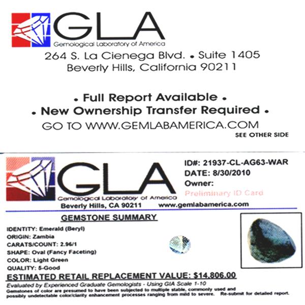 Excellent light green colored specimen oval cut; lab quality evaluation 5; treatment as noted; Gem Guide wholesale $2664-$3700; full retail appraisal $14806; full lab evaluation available