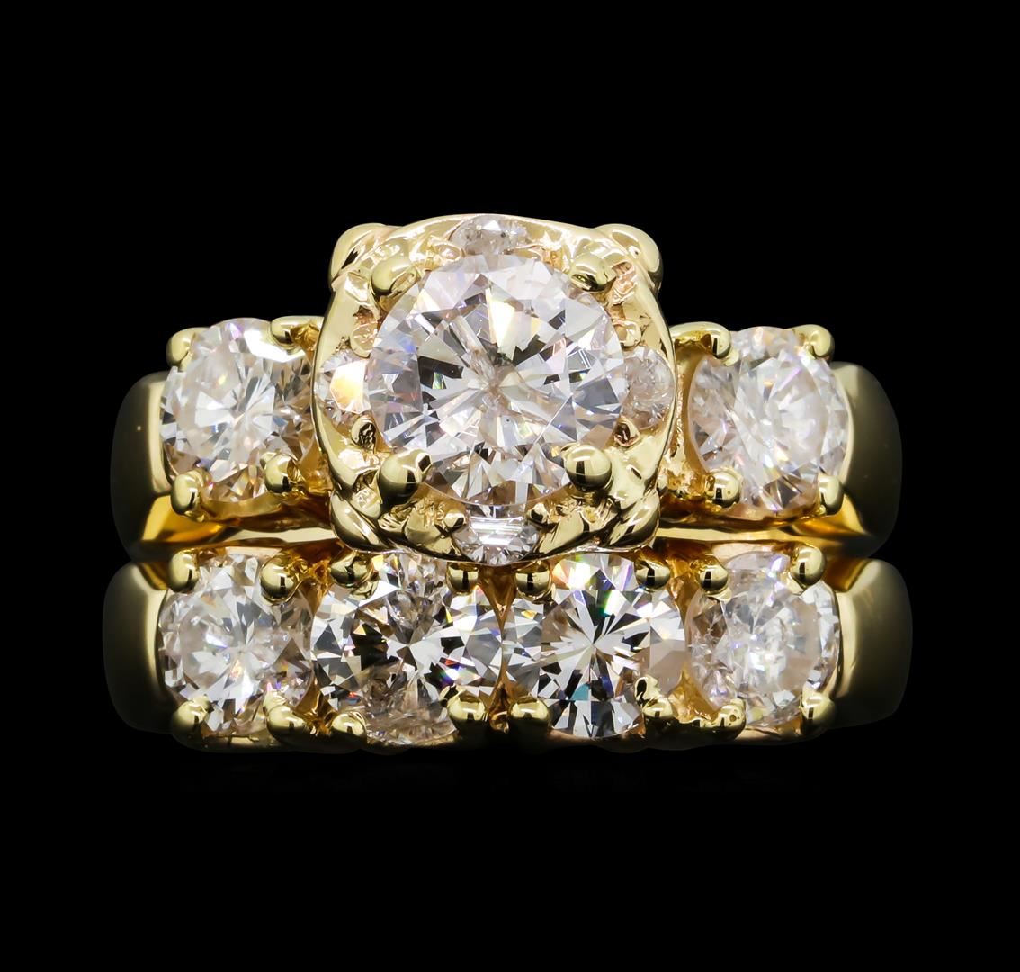 One electronically tested 14KT yellow gold lady's combination cast & assembled wedding ring soldered to wedding band with a tapered split shank with a bright polish finish. The featured lady's ring has a double shank measuring 4.42 millimeters wide. Identified with markings of '14K'. Condition is new, good workmanship. Containing: One prong set round brilliant cut diamond, measuring 6.17 - 6.12 x 3.60mm (depth est.) approximate weight of 0.85ct. Graded in the setting. Clarity I-1. Color: G Cut Very Good Six prong set round brilliant cut diamonds, measuring 4.60 - 4.40 x 2.70mm (depth est.) approximate total weight of 6 Stones = 2.00ct. Graded in the setting. Clarity I-1 to I-2. Color: H - I Cut Good Four prong set round brilliant cut diamonds, measuring 2.00 - 1.90 x 1.21mm (depth est.) approximate total weight of 4 Stones = 0.12ct. Graded in the setting. Clarity SI-2 to I-1. Color: I - J Cut Good. Total Weight of Diamonds 2.97ct.. Total Weight of Ring Soldered To Wedding Band 8.60gm GAS Appraised at $8,615.00.