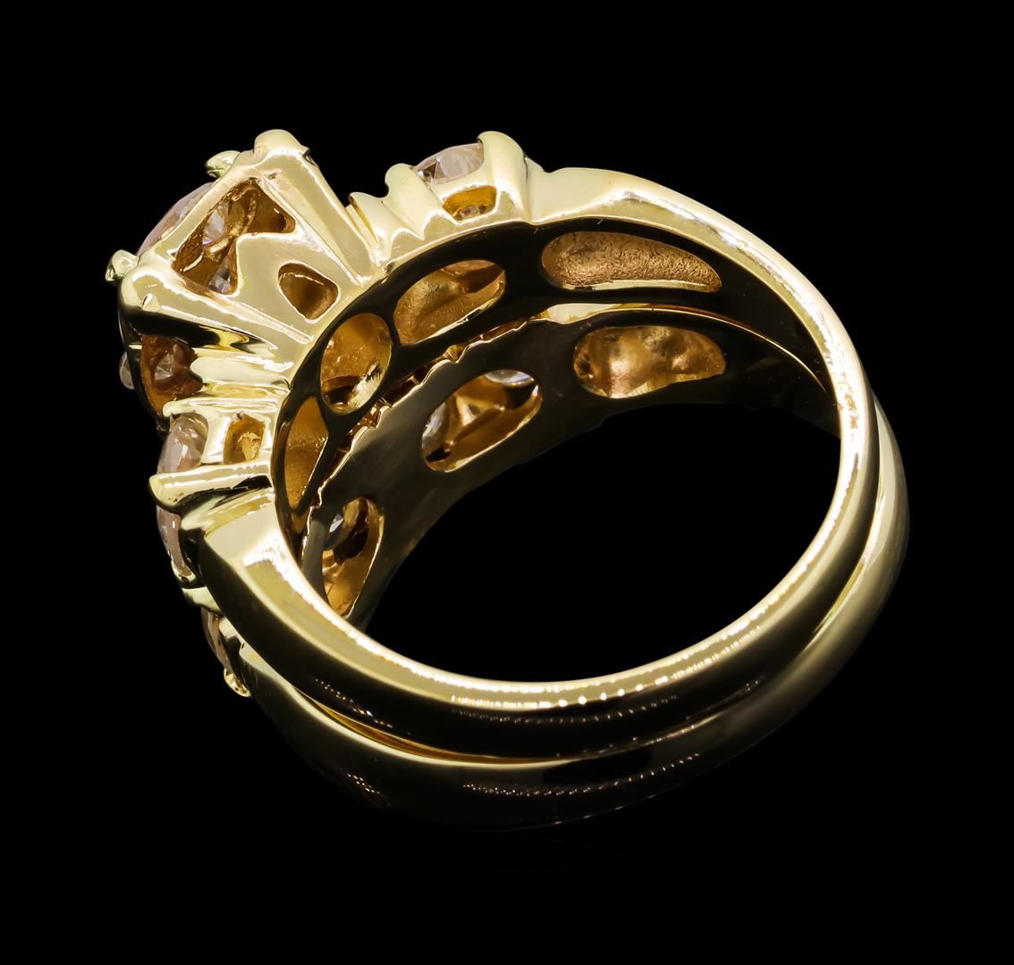 One electronically tested 14KT yellow gold lady's combination cast & assembled wedding ring soldered to wedding band with a tapered split shank with a bright polish finish. The featured lady's ring has a double shank measuring 4.42 millimeters wide. Identified with markings of '14K'. Condition is new, good workmanship. Containing: One prong set round brilliant cut diamond, measuring 6.17 - 6.12 x 3.60mm (depth est.) approximate weight of 0.85ct. Graded in the setting. Clarity I-1. Color: G Cut Very Good Six prong set round brilliant cut diamonds, measuring 4.60 - 4.40 x 2.70mm (depth est.) approximate total weight of 6 Stones = 2.00ct. Graded in the setting. Clarity I-1 to I-2. Color: H - I Cut Good Four prong set round brilliant cut diamonds, measuring 2.00 - 1.90 x 1.21mm (depth est.) approximate total weight of 4 Stones = 0.12ct. Graded in the setting. Clarity SI-2 to I-1. Color: I - J Cut Good. Total Weight of Diamonds 2.97ct.. Total Weight of Ring Soldered To Wedding Band 8.60gm GAS Appraised at $8,615.00.