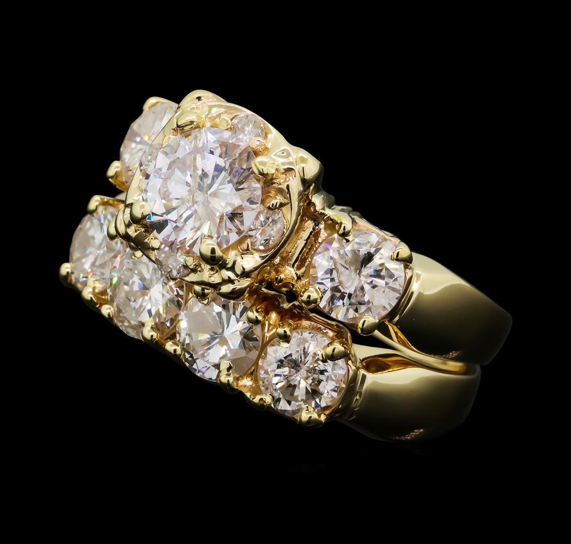 One electronically tested 14KT yellow gold lady's combination cast & assembled wedding ring soldered to wedding band with a tapered split shank with a bright polish finish. The featured lady's ring has a double shank measuring 4.42 millimeters wide. Identified with markings of '14K'. Condition is new, good workmanship. Containing: One prong set round brilliant cut diamond, measuring 6.17 - 6.12 x 3.60mm (depth est.) approximate weight of 0.85ct. Graded in the setting. Clarity I-1. Color: G Cut Very Good Six prong set round brilliant cut diamonds, measuring 4.60 - 4.40 x 2.70mm (depth est.) approximate total weight of 6 Stones = 2.00ct. Graded in the setting. Clarity I-1 to I-2. Color: H - I Cut Good Four prong set round brilliant cut diamonds, measuring 2.00 - 1.90 x 1.21mm (depth est.) approximate total weight of 4 Stones = 0.12ct. Graded in the setting. Clarity SI-2 to I-1. Color: I - J Cut Good. Total Weight of Diamonds 2.97ct.. Total Weight of Ring Soldered To Wedding Band 8.60gm GAS Appraised at $8,615.00.
