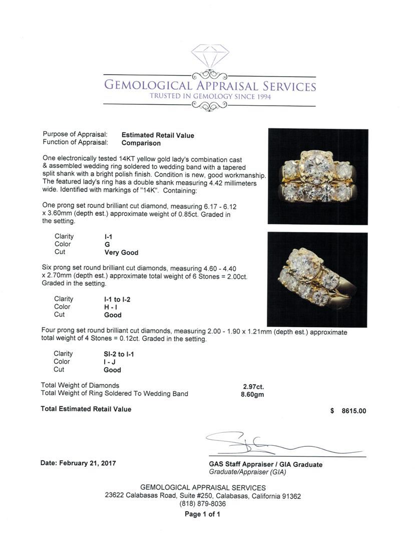 One electronically tested 14KT yellow gold lady's combination cast & assembled wedding ring soldered to wedding band with a tapered split shank with a bright polish finish. The featured lady's ring has a double shank measuring 4.42 millimeters wide. Identified with markings of '14K'. Condition is new, good workmanship. Containing: One prong set round brilliant cut diamond, measuring 6.17 - 6.12 x 3.60mm (depth est.) approximate weight of 0.85ct. Graded in the setting. Clarity I-1. Color: G Cut Very Good Six prong set round brilliant cut diamonds, measuring 4.60 - 4.40 x 2.70mm (depth est.) approximate total weight of 6 Stones = 2.00ct. Graded in the setting. Clarity I-1 to I-2. Color: H - I Cut Good Four prong set round brilliant cut diamonds, measuring 2.00 - 1.90 x 1.21mm (depth est.) approximate total weight of 4 Stones = 0.12ct. Graded in the setting. Clarity SI-2 to I-1. Color: I - J Cut Good. Total Weight of Diamonds 2.97ct.. Total Weight of Ring Soldered To Wedding Band 8.60gm GAS Appraised at $8,615.00.