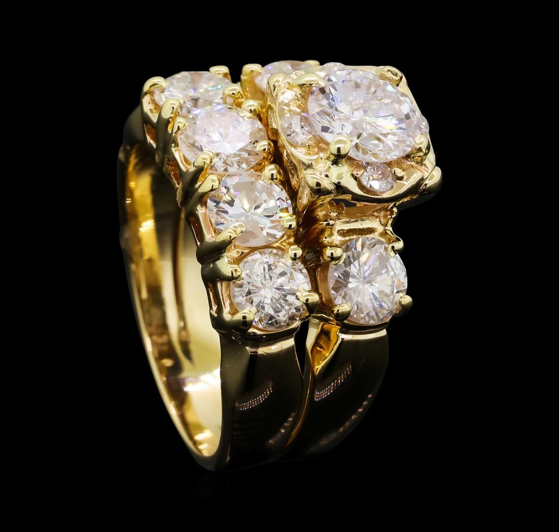 One electronically tested 14KT yellow gold lady's combination cast & assembled wedding ring soldered to wedding band with a tapered split shank with a bright polish finish. The featured lady's ring has a double shank measuring 4.42 millimeters wide. Identified with markings of '14K'. Condition is new, good workmanship. Containing: One prong set round brilliant cut diamond, measuring 6.17 - 6.12 x 3.60mm (depth est.) approximate weight of 0.85ct. Graded in the setting. Clarity I-1. Color: G Cut Very Good Six prong set round brilliant cut diamonds, measuring 4.60 - 4.40 x 2.70mm (depth est.) approximate total weight of 6 Stones = 2.00ct. Graded in the setting. Clarity I-1 to I-2. Color: H - I Cut Good Four prong set round brilliant cut diamonds, measuring 2.00 - 1.90 x 1.21mm (depth est.) approximate total weight of 4 Stones = 0.12ct. Graded in the setting. Clarity SI-2 to I-1. Color: I - J Cut Good. Total Weight of Diamonds 2.97ct.. Total Weight of Ring Soldered To Wedding Band 8.60gm GAS Appraised at $8,615.00.