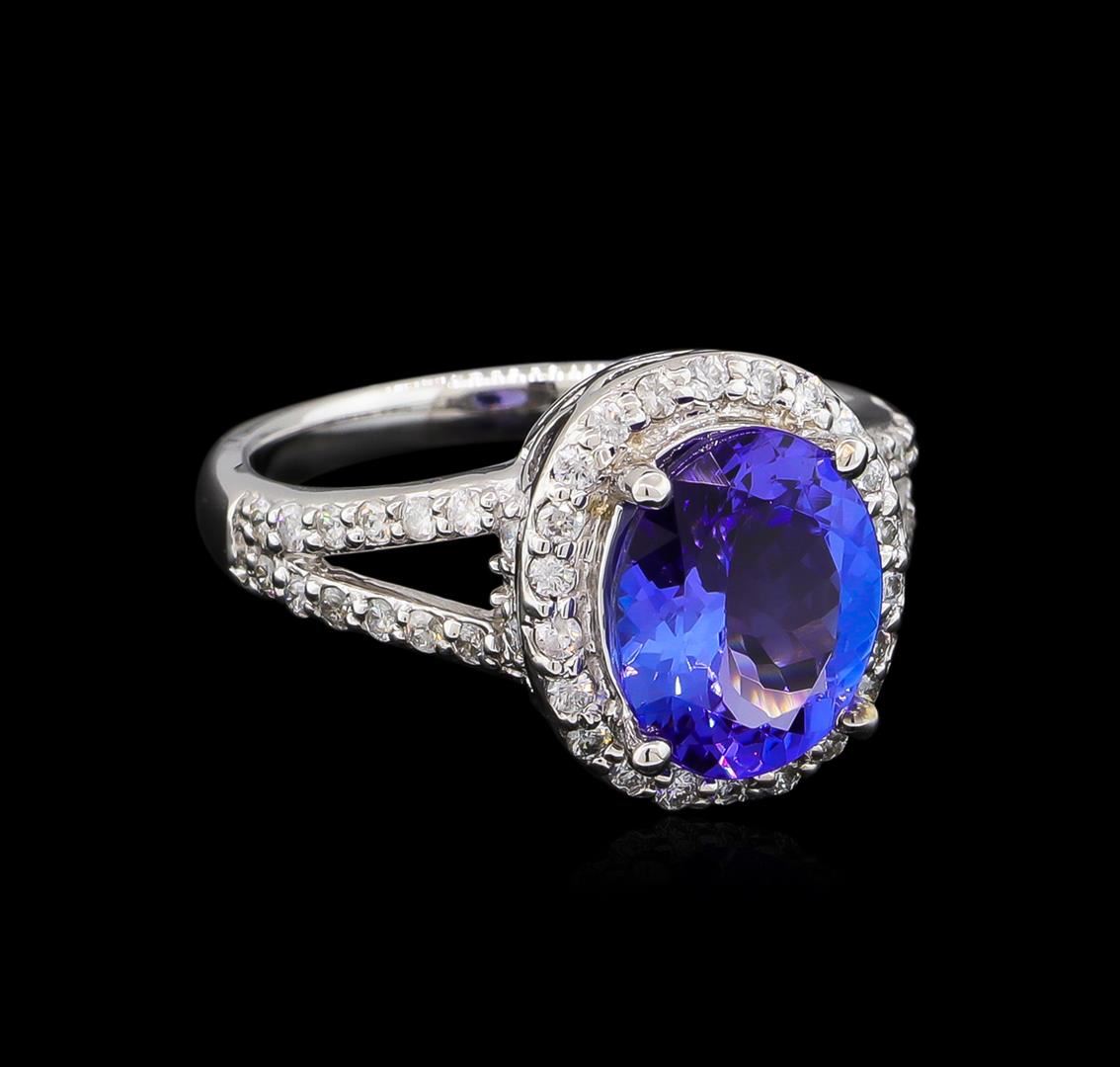 One electronically tested 14KT white gold lady's cast fashion ring with a split shank halo with a bright polish finish. The featured lady's ring has a shank measuring 2.32 millimeters wide. Identified with markings of "14K". Condition is new, good workmanship. Containing: One prong set oval modified brilliant cut natural tanzanite, measuring 10.47 x 8.48 x 4.84mm, approximate weight of 2.97ct., clarity is eye clean, type I, medium, moderately strong, violetish blue color, (GIA vB 5/4), cut is very good. Transmitting light with no distortion, transparent. Colored gemstones are presumed to have been subjected to commonly used enhancement processes. Graded in the setting. Fifty prong set round brilliant cut diamonds, measuring 1.40 - 1.35 x 0.84mm (depth est.) approximate total weight of 50 Stones = 0.48ct. Graded in the setting. Clarity: SI-1 to I-1. Color: G - I. Cut Good. Total Weight of Colored Stones 2.97ct. Total Weight of Diamonds 0.48ct. Total Weight of Ring 5.50gm. GAS Appraised at $6,480.00.
