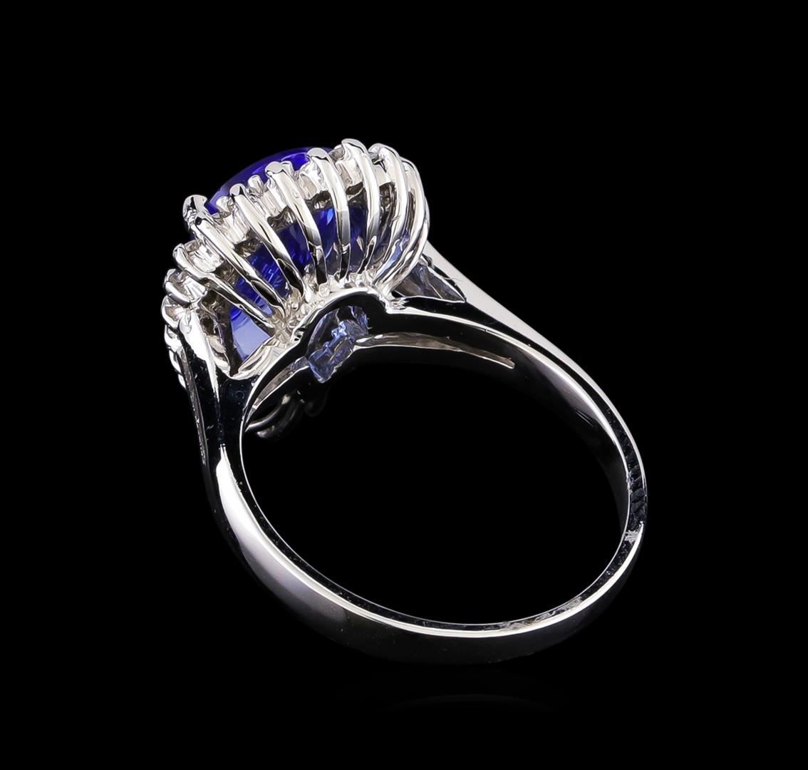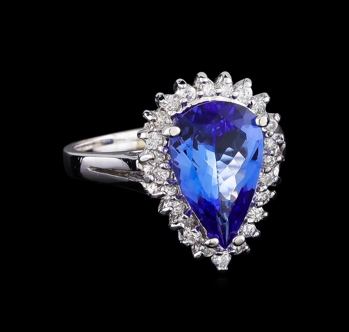 One electronically tested 14KT white gold lady's cast fashion ring with a basket halo with a bright polish finish. The featured lady's ring has a shank measuring 2.04 millimeters in width. Identified with markings of "14K". Condition is new, good workmanship. Containing: One prong set pear modified brilliant cut natural tanzanite, measuring 13.18 x 8.50 x 4.45mm, (depth est.) approximate weight of 2.97ct., clarity is eye clean, medium, moderately strong, bluish violet color, (GIA bV 5/4), cut is very good. Transmitting light with no distortion, transparent. Colored gemstones are presumed to have been subjected to commonly used enhancement processes. Graded in the setting. Twenty-Four prong set round brilliant cut diamonds, measuring 1.60 - 1.50 x 0.93mm (depth est.) approximate total weight of 24 Stones = 0.34ct. Graded in the setting. Clarity: SI-1 to SI-2. Color: G - Good. Total Weight of Colored Stones 2.97ct. Total Weight of Diamonds 0.34ct. Total Weight of Ring 5.80gm GAS Appraised at $5,965.00.
