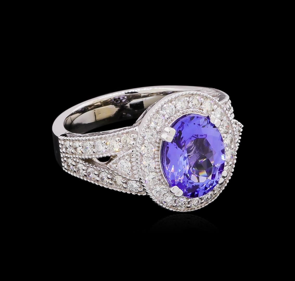 One electronically tested 14KT white gold lady's cast fashion ring with a split shank halo with a bright polish with milgrain detailing finish. The featured lady's ring has a shank measuring 3.81 millimeters wide. Identified with markings of "K14". Condition is new, good workmanship. Containing: One prong set oval modified brilliant cut natural tanzanite, measuring 10.39 x 8.47 x 5.00mm, approximate weight of 2.97ct., clarity is eye clean, type I, medium dark, moderately strong, violetish blue color, (GIA vB 6/4), cut is very good. Transmitting light with no distortion, transparent. Colored gemstones are presumed to have been subjected to commonly used enhancement processes. Graded in the setting. Forty-Six prong set round brilliant cut diamonds, measuring 1.80 - 1.70 x 1.09mm (depth est.) approximate total weight of 46 Stones = 0.95ct. Graded in the setting. Clarity: VS-2 to SI-2. Color: G - Very Good. Total Weight of Colored Stones 2.97ct. Total Weight of Diamonds 0.95ct. Total Weight of Ring 7.90gm. GAS Appraised at $8,795.00.