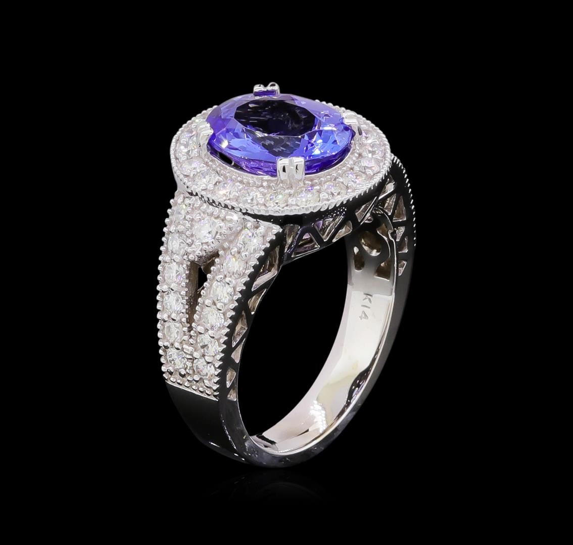 One electronically tested 14KT white gold lady's cast fashion ring with a split shank halo with a bright polish with milgrain detailing finish. The featured lady's ring has a shank measuring 3.81 millimeters wide. Identified with markings of "K14". Condition is new, good workmanship. Containing: One prong set oval modified brilliant cut natural tanzanite, measuring 10.39 x 8.47 x 5.00mm, approximate weight of 2.97ct., clarity is eye clean, type I, medium dark, moderately strong, violetish blue color, (GIA vB 6/4), cut is very good. Transmitting light with no distortion, transparent. Colored gemstones are presumed to have been subjected to commonly used enhancement processes. Graded in the setting. Forty-Six prong set round brilliant cut diamonds, measuring 1.80 - 1.70 x 1.09mm (depth est.) approximate total weight of 46 Stones = 0.95ct. Graded in the setting. Clarity: VS-2 to SI-2. Color: G - Very Good. Total Weight of Colored Stones 2.97ct. Total Weight of Diamonds 0.95ct. Total Weight of Ring 7.90gm. GAS Appraised at $8,795.00.