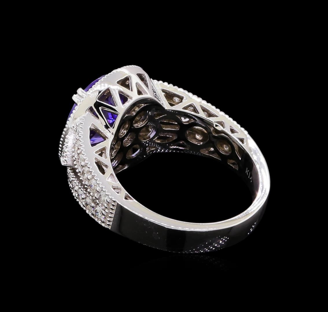 One electronically tested 14KT white gold lady's cast fashion ring with a split shank halo with a bright polish with milgrain detailing finish. The featured lady's ring has a shank measuring 3.81 millimeters wide. Identified with markings of "K14". Condition is new, good workmanship. Containing: One prong set oval modified brilliant cut natural tanzanite, measuring 10.39 x 8.47 x 5.00mm, approximate weight of 2.97ct., clarity is eye clean, type I, medium dark, moderately strong, violetish blue color, (GIA vB 6/4), cut is very good. Transmitting light with no distortion, transparent. Colored gemstones are presumed to have been subjected to commonly used enhancement processes. Graded in the setting. Forty-Six prong set round brilliant cut diamonds, measuring 1.80 - 1.70 x 1.09mm (depth est.) approximate total weight of 46 Stones = 0.95ct. Graded in the setting. Clarity: VS-2 to SI-2. Color: G - Very Good. Total Weight of Colored Stones 2.97ct. Total Weight of Diamonds 0.95ct. Total Weight of Ring 7.90gm. GAS Appraised at $8,795.00.