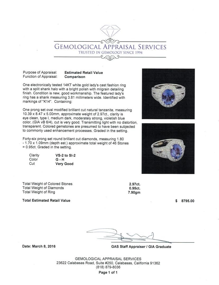 One electronically tested 14KT white gold lady's cast fashion ring with a split shank halo with a bright polish with milgrain detailing finish. The featured lady's ring has a shank measuring 3.81 millimeters wide. Identified with markings of "K14". Condition is new, good workmanship. Containing: One prong set oval modified brilliant cut natural tanzanite, measuring 10.39 x 8.47 x 5.00mm, approximate weight of 2.97ct., clarity is eye clean, type I, medium dark, moderately strong, violetish blue color, (GIA vB 6/4), cut is very good. Transmitting light with no distortion, transparent. Colored gemstones are presumed to have been subjected to commonly used enhancement processes. Graded in the setting. Forty-Six prong set round brilliant cut diamonds, measuring 1.80 - 1.70 x 1.09mm (depth est.) approximate total weight of 46 Stones = 0.95ct. Graded in the setting. Clarity: VS-2 to SI-2. Color: G - Very Good. Total Weight of Colored Stones 2.97ct. Total Weight of Diamonds 0.95ct. Total Weight of Ring 7.90gm.