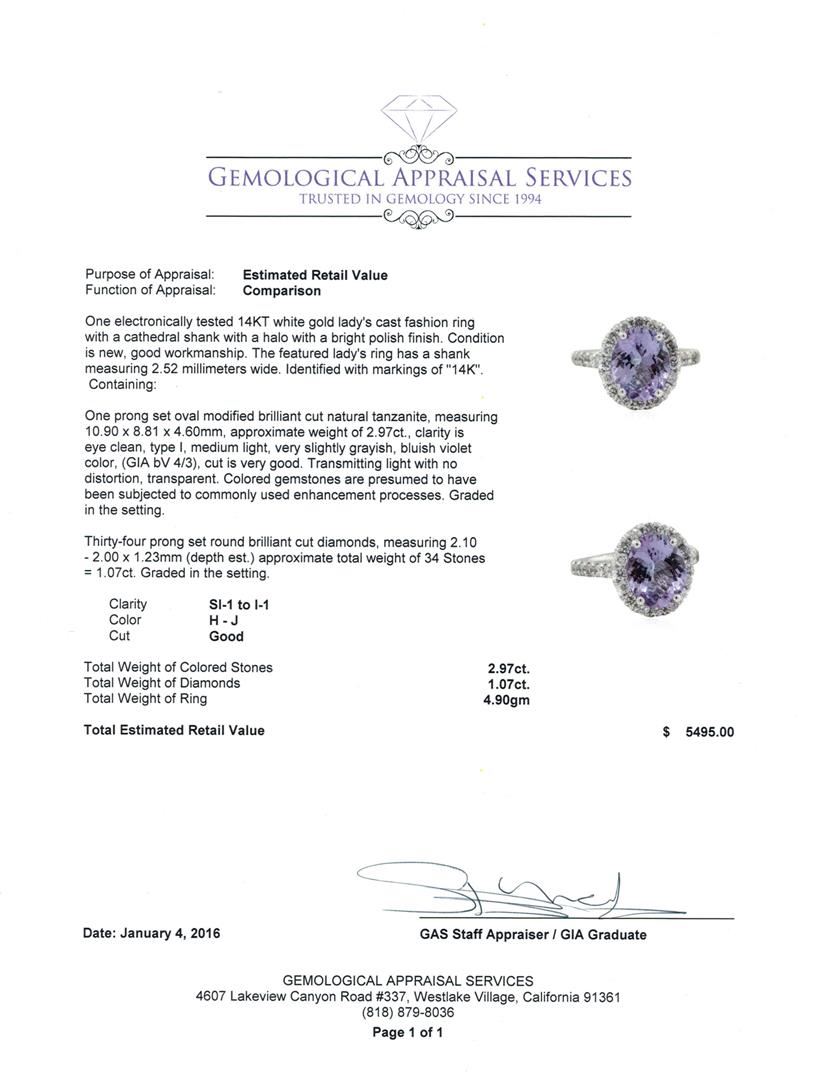 One electronically tested 14KT white gold lady's cast fashion ring with a cathedral shank with a halo with a bright polish finish. The featured lady's ring has a shank measuring 2.52 millimeters wide. Identified with markings of "14K". Condition is new, good workmanship. Containing: One prong set oval modified brilliant cut natural tanzanite, measuring 10.90 x 8.81 x 4.60mm, approximate weight of 2.97ct., clarity is eye clean, type I, medium light, very slightly grayish, bluish violet color, (GIA bV 4/3), cut is very good. Transmitting light with no distortion, transparent. Colored gemstones are presumed to have been subjected to commonly used enhancement processes. Graded in the setting. Thirty-Four prong set round brilliant cut diamonds, measuring 2.10 - 2.00 x 1.23mm (depth est.) approximate total weight of 34 Stones = 1.07ct. Graded in the setting. Clarity: SI-1 to I-1. Color: H - Good. Total Weight of Colored Stones 2.97ct. Total Weight of Diamonds 1.07ct. Total Weight of Ring 4.90gm. GAS Appraised at $5,495.00.