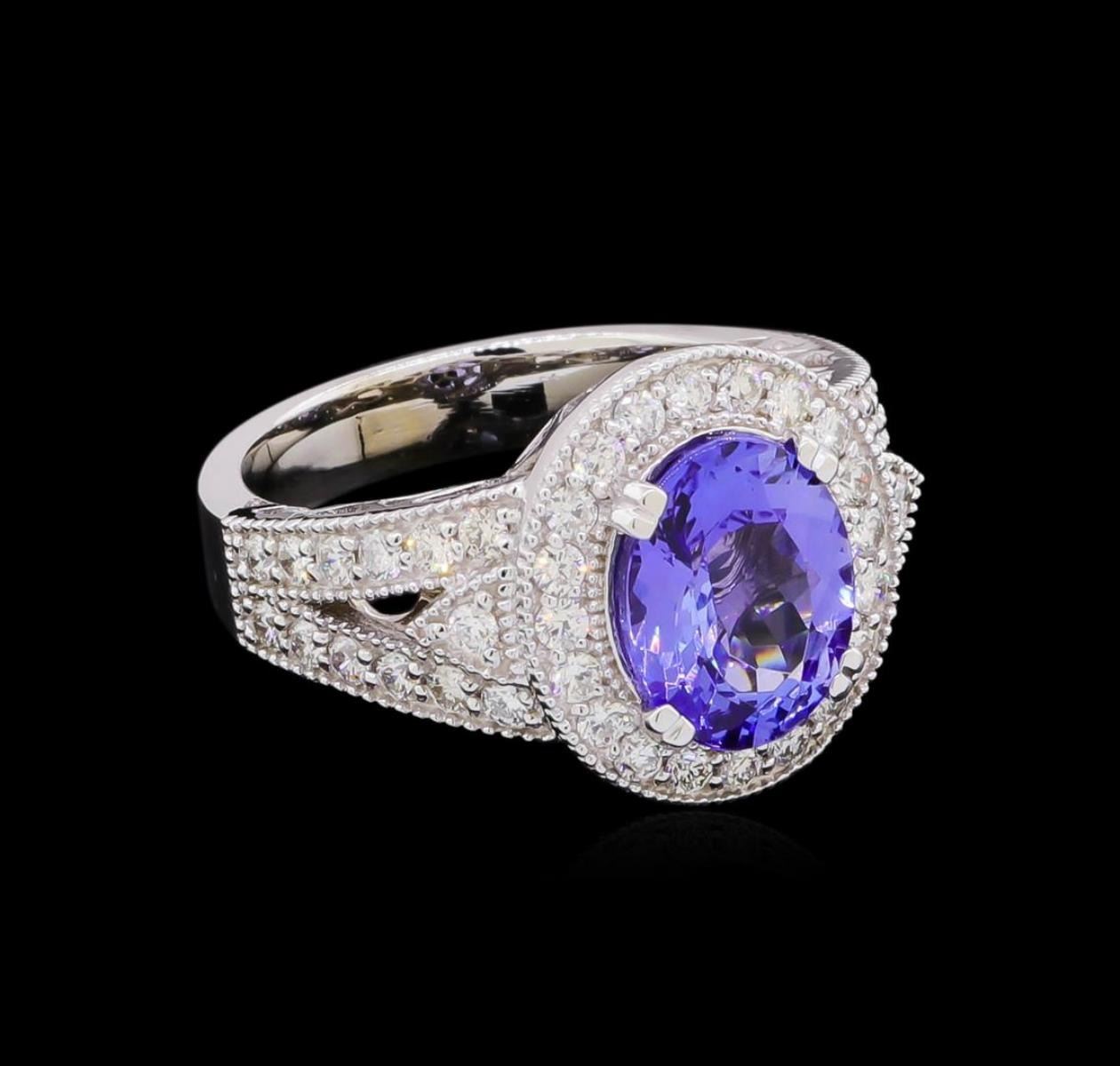 One electronically tested 14KT white gold lady's cast fashion ring with a split shank halo with a bright polish with milgrain detailing finish. The featured lady's ring has a shank measuring 3.81 millimeters wide. Identified with markings of "K14". Condition is new, good workmanship. Containing: One prong set oval modified brilliant cut natural tanzanite, measuring 10.39 x 8.47 x 5.00mm, approximate weight of 2.97ct., clarity is eye clean, type I, medium dark, moderately strong, violetish blue color, (GIA vB 6/4), cut is very good. Transmitting light with no distortion, transparent. Colored gemstones are presumed to have been subjected to commonly used enhancement processes. Graded in the setting. Forty-Six prong set round brilliant cut diamonds, measuring 1.80 - 1.70 x 1.09mm (depth est.) approximate total weight of 46 Stones = 0.95ct. Graded in the setting. Clarity: VS-2 to SI-2. Color: G - Very Good. Total Weight of Colored Stones 2.97ct. Total Weight of Diamonds 0.95ct. Total Weight of Ring 7.90gm.