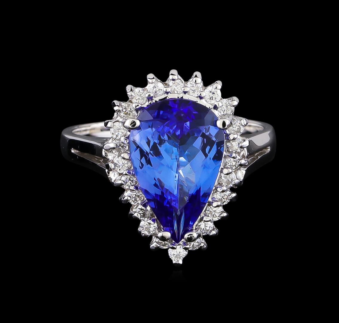 One electronically tested 14KT white gold lady's cast fashion ring with a basket halo with a bright polish finish. The featured lady's ring has a shank measuring 2.04 millimeters in width. Identified with markings of "14K". Condition is new, good workmanship. Containing: One prong set pear modified brilliant cut natural tanzanite, measuring 13.18 x 8.50 x 4.45mm, (depth est.) approximate weight of 2.97ct., clarity is eye clean, medium, moderately strong, bluish violet color, (GIA bV 5/4), cut is very good. Transmitting light with no distortion, transparent. Colored gemstones are presumed to have been subjected to commonly used enhancement processes. Graded in the setting. Twenty-Four prong set round brilliant cut diamonds, measuring 1.60 - 1.50 x 0.93mm (depth est.) approximate total weight of 24 Stones = 0.34ct. Graded in the setting. Clarity: SI-1 to SI-2. Color: G - Good. Total Weight of Colored Stones 2.97ct. Total Weight of Diamonds 0.34ct. Total Weight of Ring 5.80gm