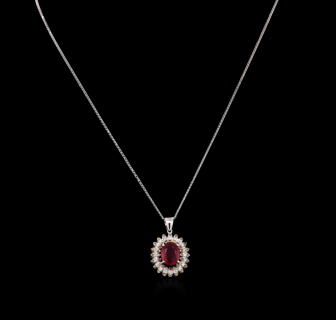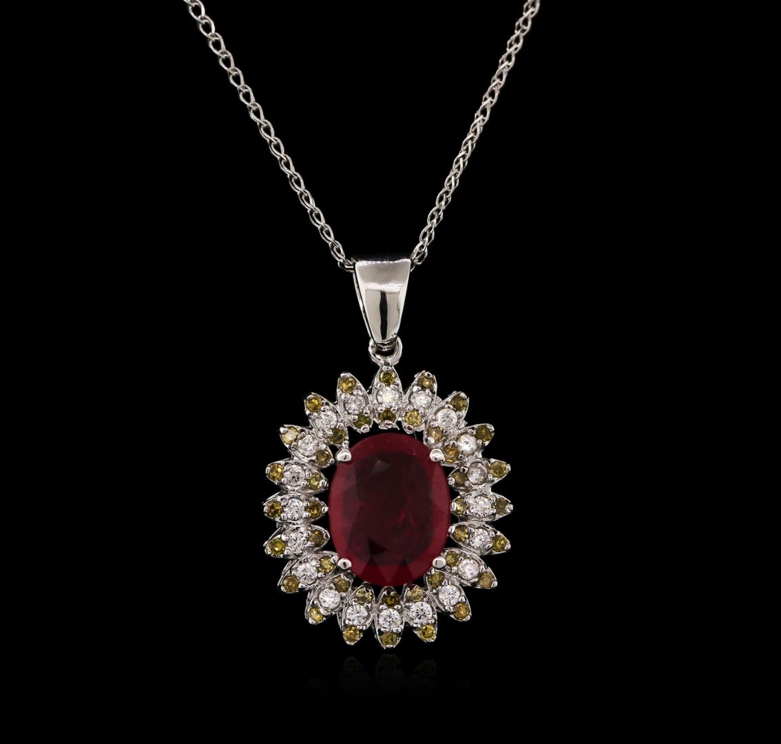 One pendant with chain featuring: 14KT white gold weighing 3.90 grams containing one ruby with a total weight of 2.97ct and 60 diamonds with a total weight of 0.55ct.