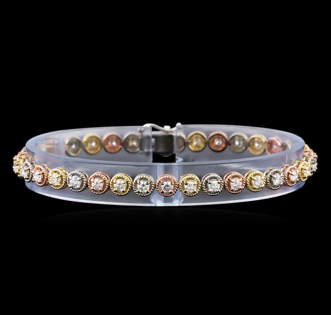 One electronically tested 14KT yellow, white, and rose gold lady's combination cast & assembled fashion bracelet with a tongue clasp with foldover safety with a bright polish finish. The featured lady's bracelet measures 7.25 inches in length. Identified with markings of "K14". Condition is new, good workmanship. Containing: Thirty-Five prong set round brilliant cut diamonds, measuring 2.90 - 2.80 x 1.71mm (depth est.) approximate total weight of 35 Stones = 2.98ct. Graded in the setting. Clarity: VS-2 to SI-1. Color: H - J. Cut Very Good. Total Weight of Diamonds 2.98ct. Total Weight of Bracelet 12.00gm GAS Appraised at $9,600.00.