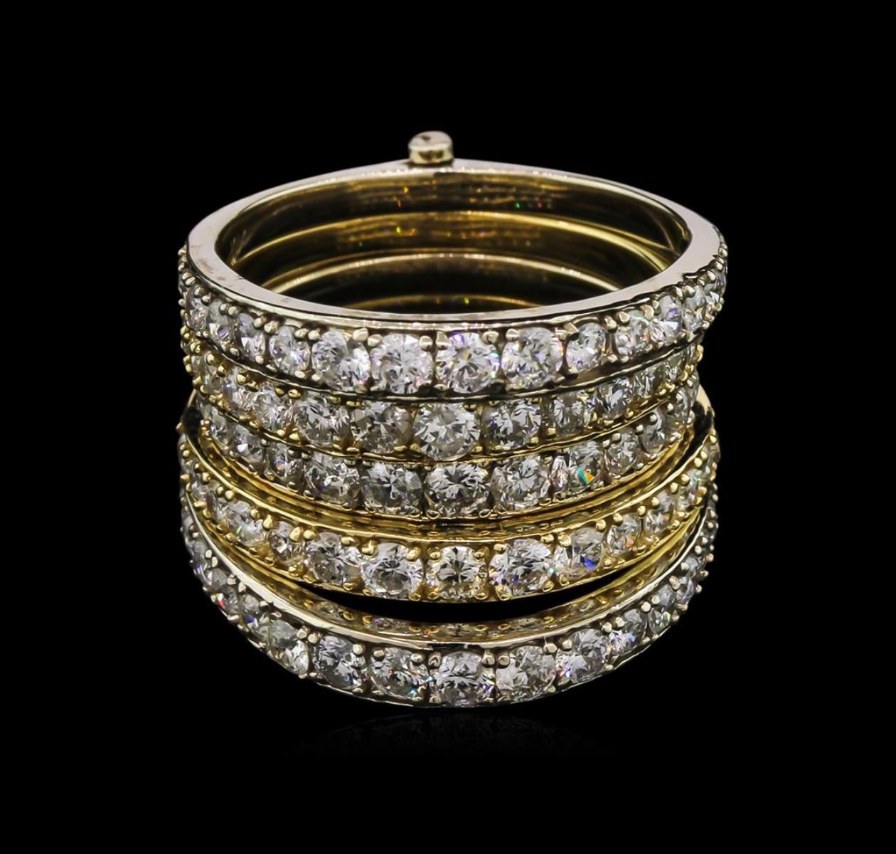 One electronically tested 14KT white and yellow gold lady's combination cast & assembled fashion ring with a bright polish finish. The featured ladies ring has five (5) tapered and graduated diamond bands that are pinned at the bottom of the shank allowing movement of all five bands, the ladies ring has a10.75 millimeter shank in width. Identified with markings of "K14". Condition is new, good workmanship. Containing: Seventy-Seven prong set round brilliant cut diamonds, measuring 2.80 - 1.80 x 1.40mm (depth est.) approximate total weight of 77 Stones = 2.98ct. Graded in the setting. Clarity: SI-2 to I-1. Color: I - Good. Total Weight of Diamonds 2.98ct. Total Weight of Ring 12.00gm. GAS Appraised.