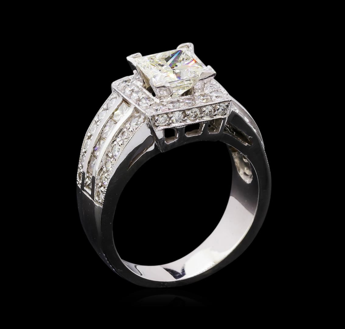 One electronically tested 14KT white gold lady's cast three row wide band halo wedding ring with a bright polish finish. The featured ladies wedding ring has a shank measures 4.14 millimeters in width. Identified with markings of "14K". Condition is new, good workmanship. Containing: One prong set princess cut diamond, measuring 6.68 x 6.45 x 4.53mm (depth est.) approximate weight of 1.54ct. Graded in the setting. Clarity: VS-1. Color: I. Cut Very Good Ten channel set princess cut diamonds, measuring 2.40 x 2.20 x 1.65mm (depth est.) approximate total weight of 10 Stones = 0.70ct. Graded in the setting. Clarity: VS-1 to VS-2. Color: G - Very Good Fifty prong set round brilliant cut diamonds, measuring 1.60 - 1.55 x 0.98mm (depth est.) approximate total weight of 50 Stones = 0.74ct. Graded in the setting. Clarity: VS-1 to SI-1. Color: H - I. Cut Very Good. Total Weight of Diamonds 2.98ct. Total Weight of Wedding Ring 8.20gm. GAS Appraised at $25,575.00.