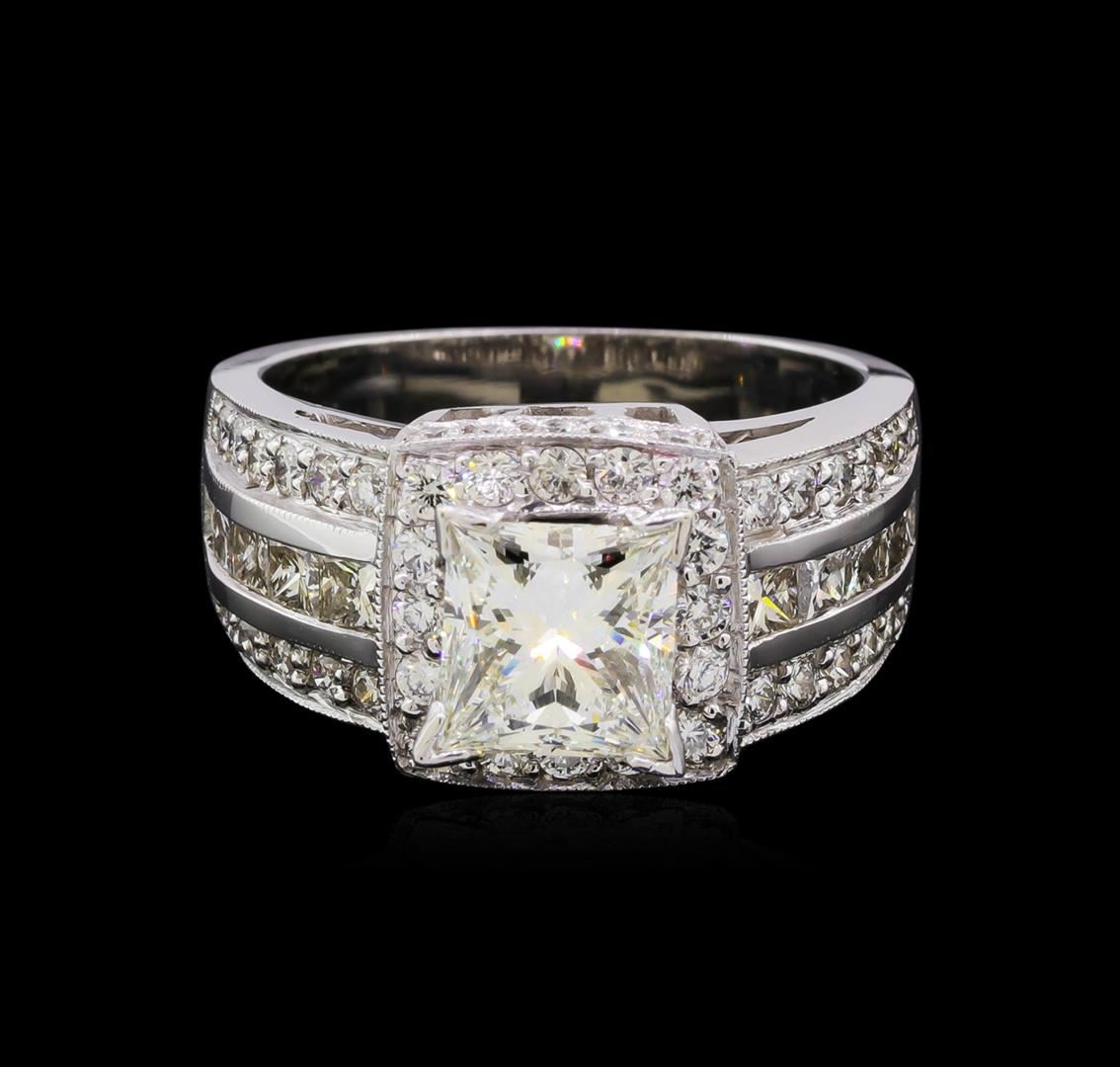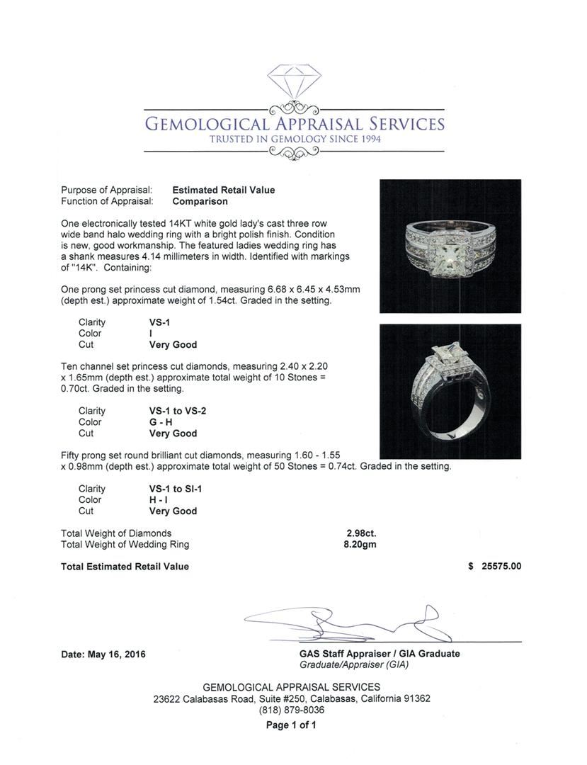 One electronically tested 14KT white gold lady's cast three row wide band halo wedding ring with a bright polish finish. The featured ladies wedding ring has a shank measures 4.14 millimeters in width. Identified with markings of "14K". Condition is new, good workmanship. Containing: One prong set princess cut diamond, measuring 6.68 x 6.45 x 4.53mm (depth est.) approximate weight of 1.54ct. Graded in the setting. Clarity: VS-1. Color: I. Cut Very Good Ten channel set princess cut diamonds, measuring 2.40 x 2.20 x 1.65mm (depth est.) approximate total weight of 10 Stones = 0.70ct. Graded in the setting. Clarity: VS-1 to VS-2. Color: G - Very Good Fifty prong set round brilliant cut diamonds, measuring 1.60 - 1.55 x 0.98mm (depth est.) approximate total weight of 50 Stones = 0.74ct. Graded in the setting. Clarity: VS-1 to SI-1. Color: H - I. Cut Very Good. Total Weight of Diamonds 2.98ct. Total Weight of Wedding Ring 8.20gm. GAS Appraised at $25,575.00.