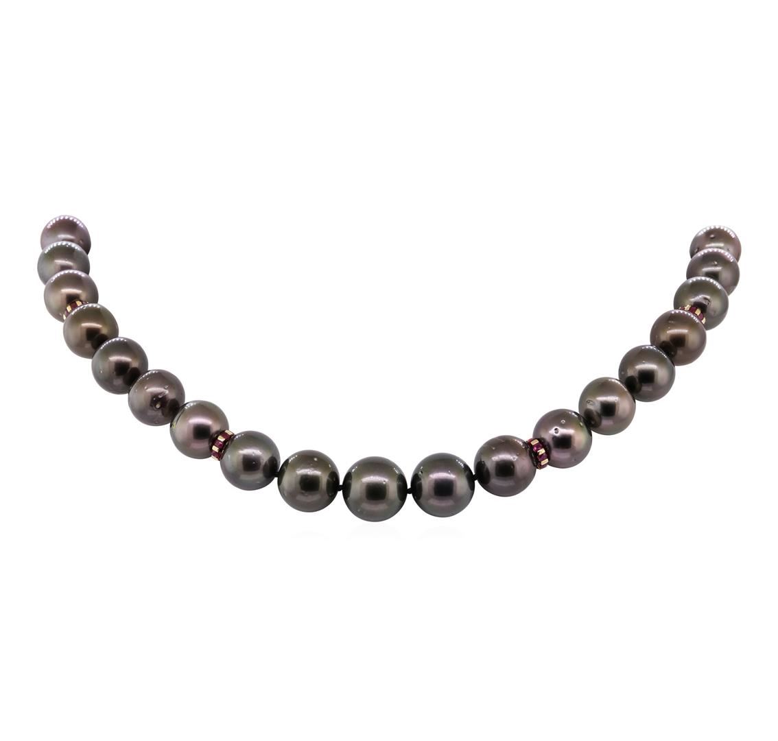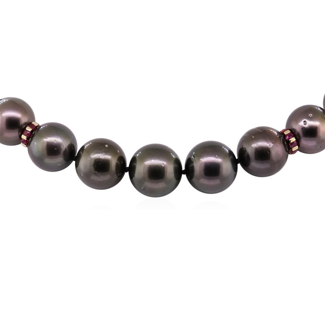 One graduated single strand pearl necklace 18.0' princess length, knotted with a tongue clasp & foldover safety containing 33 Tahitian pearls, 12.0mm to 14.8mm in size. The pearls are black in color, ros� overtone with a very good luster, round to near round, and lightly blemished with very good matching. The featured pearl necklace has a 14KT yellow gold waterfall motif clasp and rondels. Graded on the strand.Tahitian cultured pearls form in the Pinctada Margaritifera oysters. This species is native to the central and South Pacific Ocean but is generally raised in lagoons by pearl farmers. Tahitian cultured pearls take between two to four years to form. Thirteen prong set marquise modified brilliant cut natural rubies, measuring 3.10 x 1.70 x 1.11mm, (depth est.) approximate total weight of 0.52ct., clarity is eye clean, medium, strong, slightly purplish red color, (GIA slpR 5/5), cut is very good. Transmitting light with no distortion, transparent. Colored gemstones are presumed to have been subjected to commonly used enhancement processes. Graded in the setting. Forty-eight channel set round modified mixed cut natural rubies, measuring 2.10 - 2.00 x 1.33 mm, (depth est.) approximate total weight of 2.40ct., clarity is moderately included, medium dark, moderately strong, red color, (GIA R 6/4), cut is good. Transmitting light somewhat diffusely, transparent to translucent. Colored gemstones are presumed to have been subjected to commonly used enhancement processes. Graded in the setting. Fourteen prong set single cut diamonds, measuring 1.10 - 1.00 x 0.65mm (depth est.) approximate total weight of 14 Stones = 0.06ct. Graded in the setting. Color G - H Clarity VS-2 to SI-2 Cut Good. Total Weight of Colored Stones 2.92ct.. Total Weight of Diamonds 0.06ct.. Total Weight of 108.20gm GAS Appraised at $21510.00. GAS Appraised at $21,510.00.
