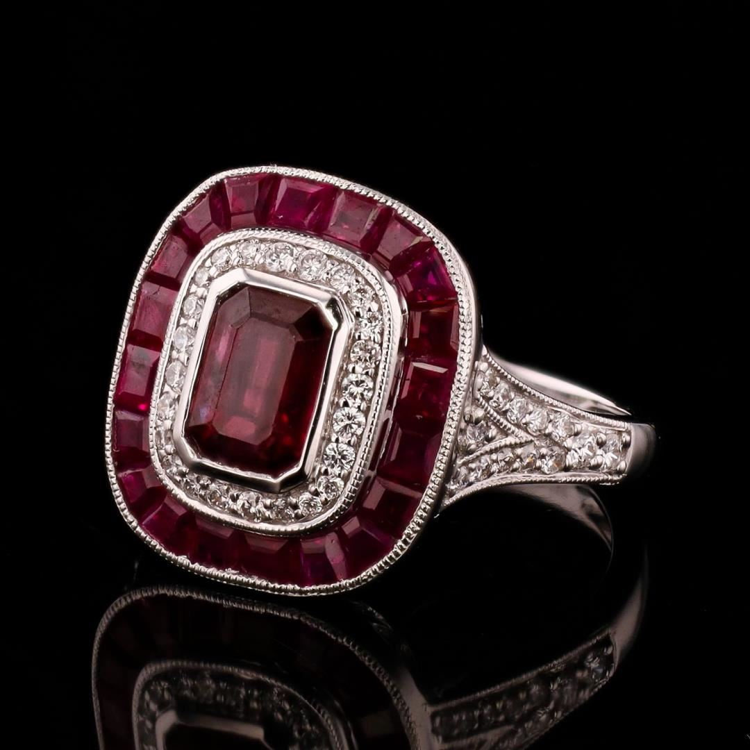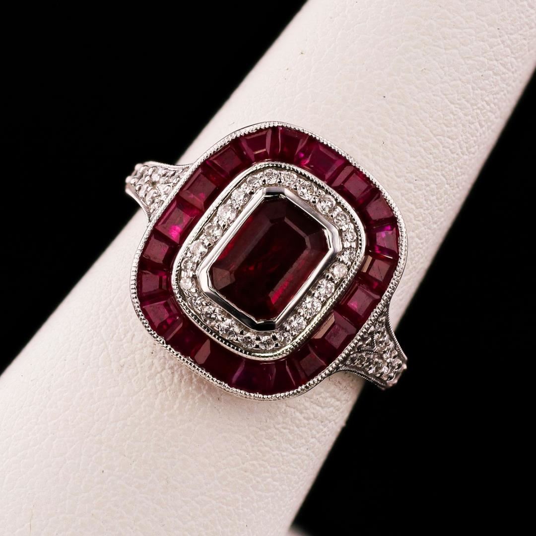 Platinum (PLAT) natural ruby corundum and diamond ring. Octagonal step and square cut natural ruby corundum gemstones are mounted in the center of the ring. Round brilliant cut diamonds accent the ring around and on both sides of the center gemstones. The ring has a gross weight of 6.5 Grams. #NATURAL GEMSTONE# GEMSTONE: Ruby Corundum NATURE: Natural SHAPE: Octagonal Step/Square, Faceted Cut WEIGHT: 2.38 carat total (21pcs.) DIMENSIONS: 7.22 x 5.43 / 2.3 x 1.9mm CLARITY: Type 3 COLOR: Red (5/5) SYMMETRY: Excellent COLOR INTENSITY: Intense TRANSPARENCY: Transparent TONE: Dark #NATURAL DIAMOND# SHAPE: Round Brilliant Cut WEIGHT: 0.33 carat total (50pcs.) DIMENSIONS: 1.5 x 1.0mm AVERAGE CLARITY: VS1-VS2 AVERAGE COLOR: F-G SYMMETRY: Excellent POLISH: Excellent #METAL# METAL: Platinum PURITY: 950 COLOR: White CONDITION: Excellent FINISH: High Polish Size: 7