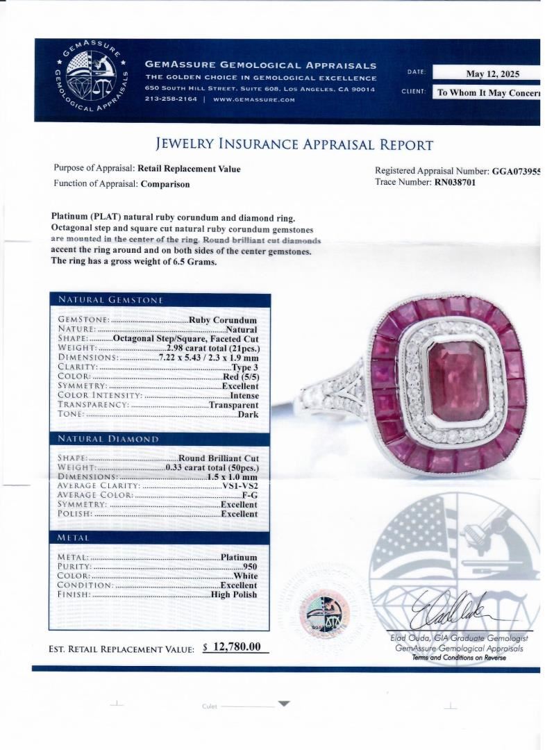 Platinum (PLAT) natural ruby corundum and diamond ring. Octagonal step and square cut natural ruby corundum gemstones are mounted in the center of the ring. Round brilliant cut diamonds accent the ring around and on both sides of the center gemstones. The ring has a gross weight of 6.5 Grams. #NATURAL GEMSTONE# GEMSTONE: Ruby Corundum NATURE: Natural SHAPE: Octagonal Step/Square, Faceted Cut WEIGHT: 2.38 carat total (21pcs.) DIMENSIONS: 7.22 x 5.43 / 2.3 x 1.9mm CLARITY: Type 3 COLOR: Red (5/5) SYMMETRY: Excellent COLOR INTENSITY: Intense TRANSPARENCY: Transparent TONE: Dark #NATURAL DIAMOND# SHAPE: Round Brilliant Cut WEIGHT: 0.33 carat total (50pcs.) DIMENSIONS: 1.5 x 1.0mm AVERAGE CLARITY: VS1-VS2 AVERAGE COLOR: F-G SYMMETRY: Excellent POLISH: Excellent #METAL# METAL: Platinum PURITY: 950 COLOR: White CONDITION: Excellent FINISH: High Polish Size: 7