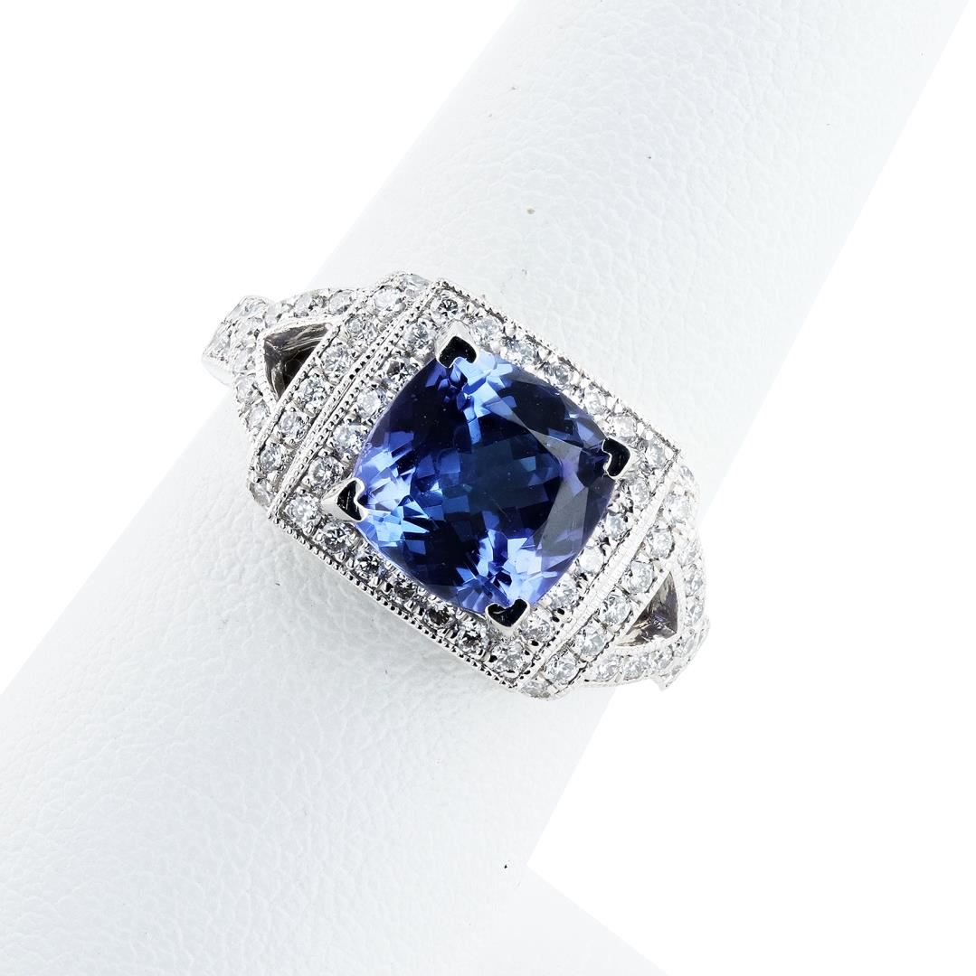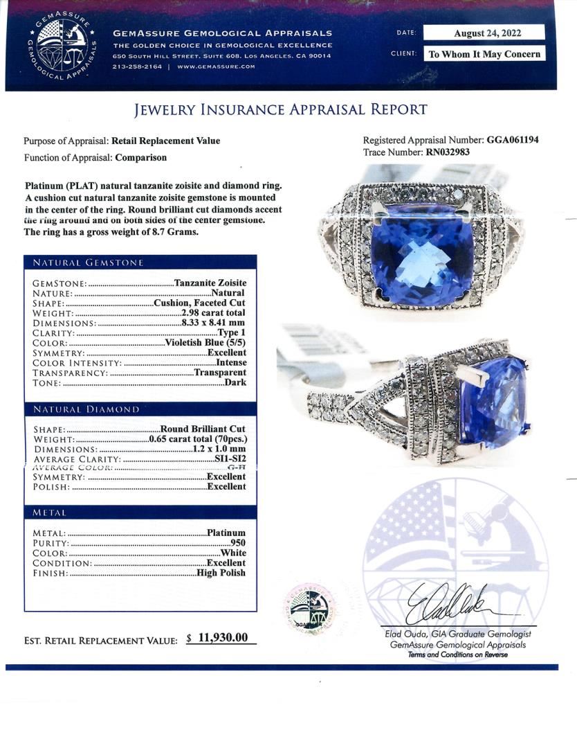 Platinum (PLAT) natural tanzanite zoisite and diamond ring. A cushion cut natural tanzanite zoisite gemstone is mounted in the center of the ring. Round brilliant cut diamonds accent the ring around and on both sides of the center gemstone. The ring has a gross weight of 8.7 Grams. #NATURAL GEMSTONE# GEMSTONE: Tanzanite Zoisite NATURE: Natural SHAPE: Cushion, Faceted Cut WEIGHT: 2.98 carat total DIMENSIONS: 8.33 x 8.41mm CLARITY: Type 1 COLOR: Violetish Blue (5/5) SYMMETRY: Excellent COLOR INTENSITY: Intense TRANSPARENCY: Transparent TONE: Dark #NATURAL DIAMOND# SHAPE: Round Brilliant Cut WEIGHT: 0.65 carat total (70pcs.) DIMENSIONS: 1.2 X 1.0mm AVERAGE CLARITY: SI1-SI2 AVERAGE COLOR: G-H SYMMETRY: Excellent POLISH: Excellent #METAL# METAL: Platinum PURITY: 950 COLOR: White CONDITION: Excellent FINISH: High Polish