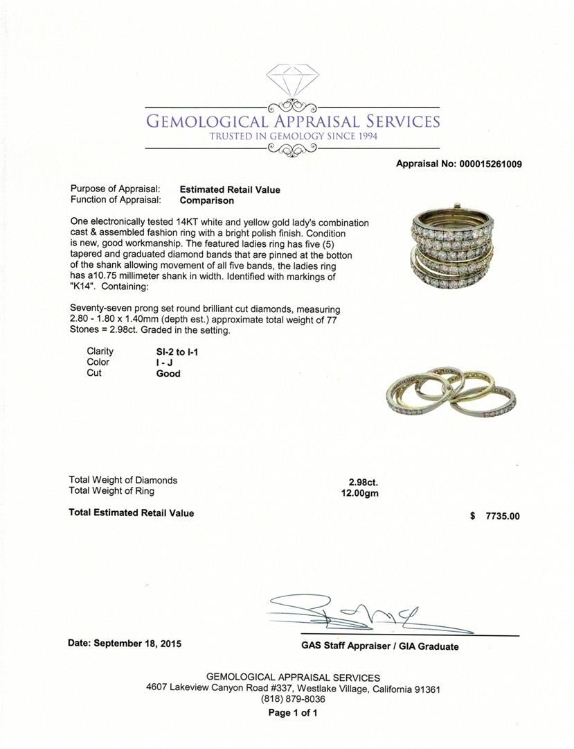 One electronically tested 14KT white and yellow gold lady's combination cast & assembled fashion ring with a bright polish finish. The featured ladies ring has five (5) tapered and graduated diamond bands that are pinned at the bottom of the shank allowing movement of all five bands, the ladies ring has a10.75 millimeter shank in width. Identified with markings of "K14". Condition is new, good workmanship. Containing: Seventy-Seven prong set round brilliant cut diamonds, measuring 2.80 - 1.80 x 1.40mm (depth est.) approximate total weight of 77 Stones = 2.98ct. Graded in the setting. Clarity: SI-2 to I-1. Color: I - Good. Total Weight of Diamonds 2.98ct. Total Weight of Ring 12.00gm. GAS Appraised at $7,735.00.