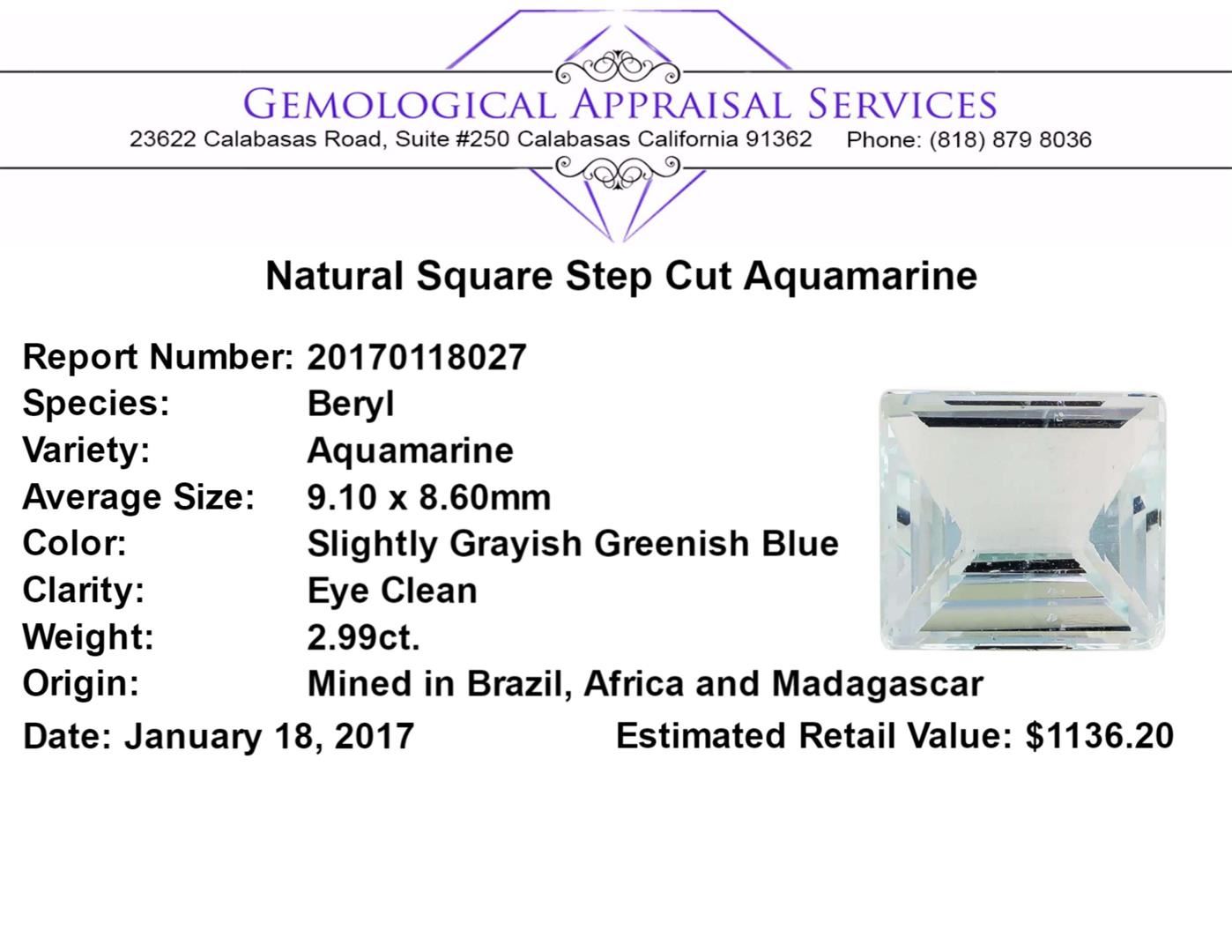 One natural square step cut aquamarine with an exact weight of 2.99ct., clarity is eye clean, slightly grayish greenish blue. Gemological Appraisals Services estimates the retail value at $1136.2 GAS Appraised.