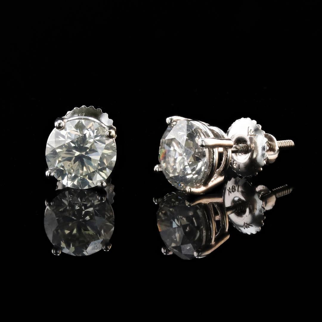 ONE 18K WHITE GOLD LADY'S CUSTOM MADE LADY'S PAIR OF DIAMOND STUD STYLE EARRINGS . SCREW BACKINGS #1 - MAIN CENTER GEMSTONE(S)# IDENTITY: TWO CENTER NATURAL DIAMONDS SET IN 4 PRONGS SETTING STYLE; CARAT WEIGHT: 2.99 CTS TW FOR THE PAIR; SHAPE , MEASUREIVIEMT and QUALITY: (1) - ONE ROUND BRILLIANT CUT TW: 1.51 CTS, I COLOR, SI3 CLARITY, EGL REPORT #US 919436116D; (2) - ONE ROUND BRILLIANT CUT TW: 1.48 CTS, J COLOR, SI3 CLARITY, EGL REPORT #US 917731006D; TOTAL DIAMONDS WEIGHT: 2.99 CTS