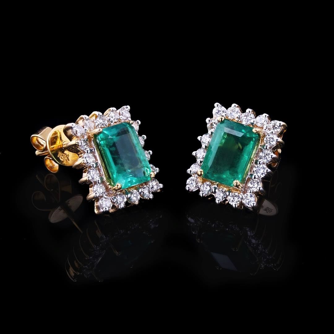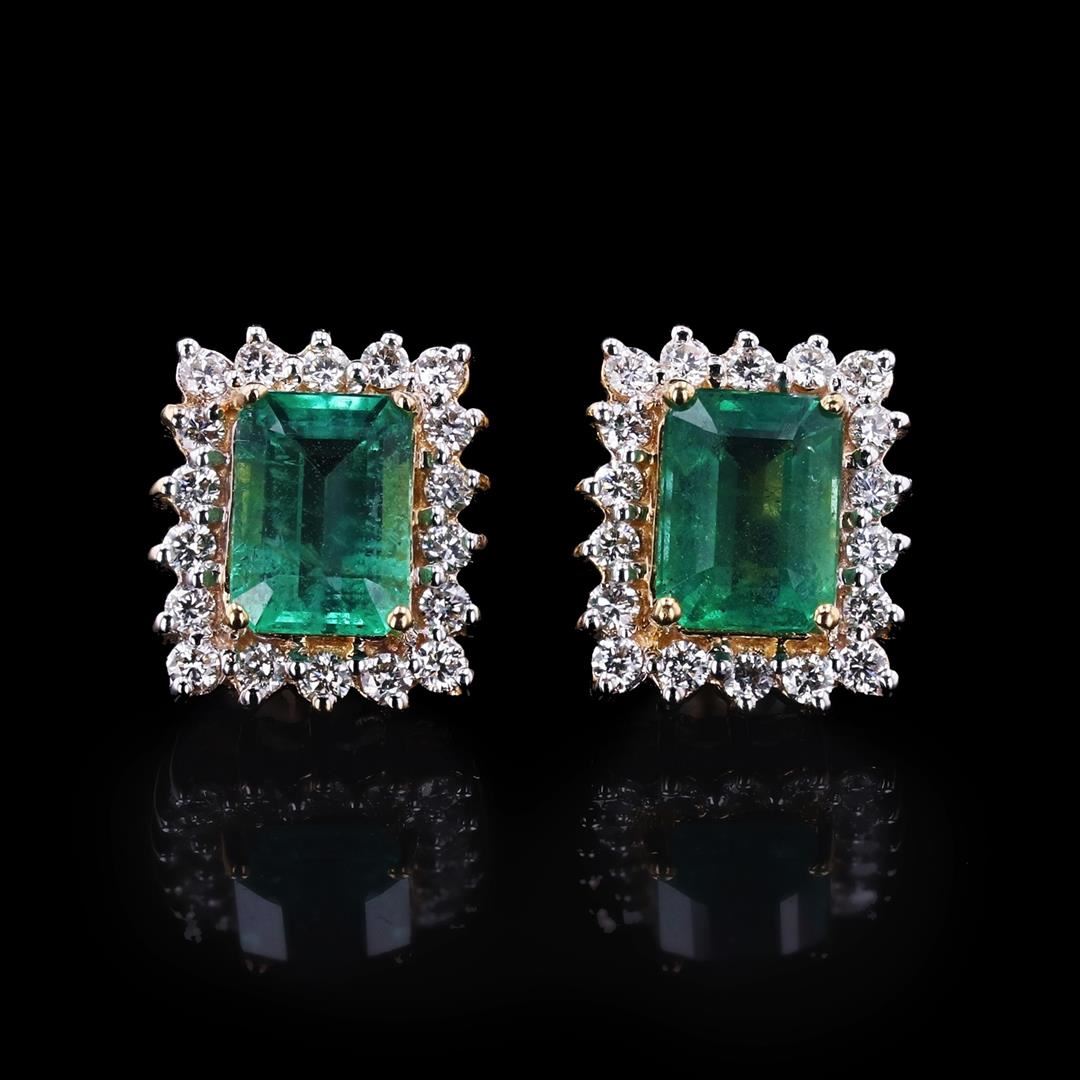2.99ctw Emerald and 0.66ctw Diamond 18K Yellow Gold Earrings. Please see Photos and Description for all available information. This pair of 18K yellow gold earrings comes with a total of 0.66 carats of diamonds and 2.99 carats of emeralds. The emeralds are recatangular cut cornered, very rare and hard to find. The diamonds are round brilliant cut, and are VS-SI clarity and G-H color.