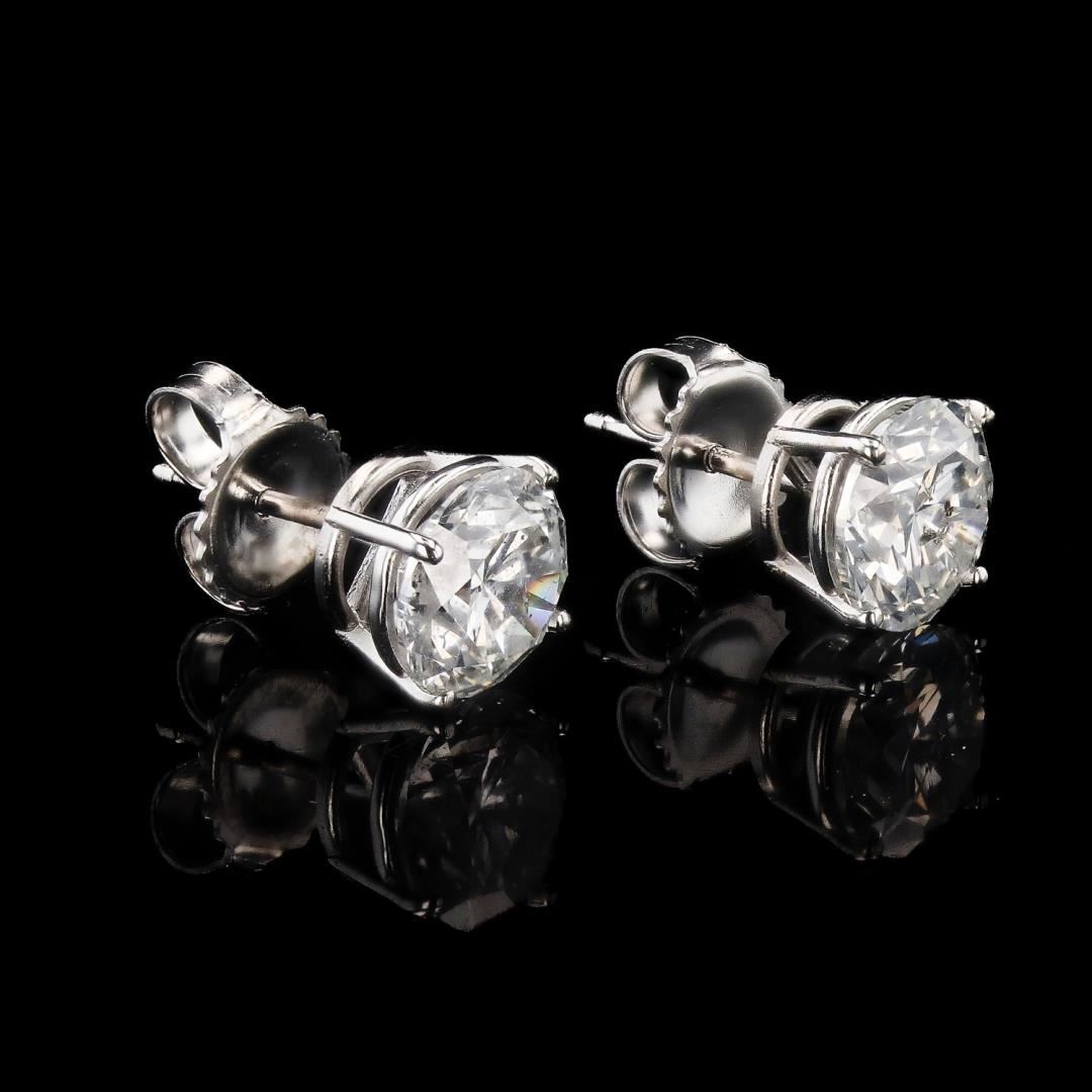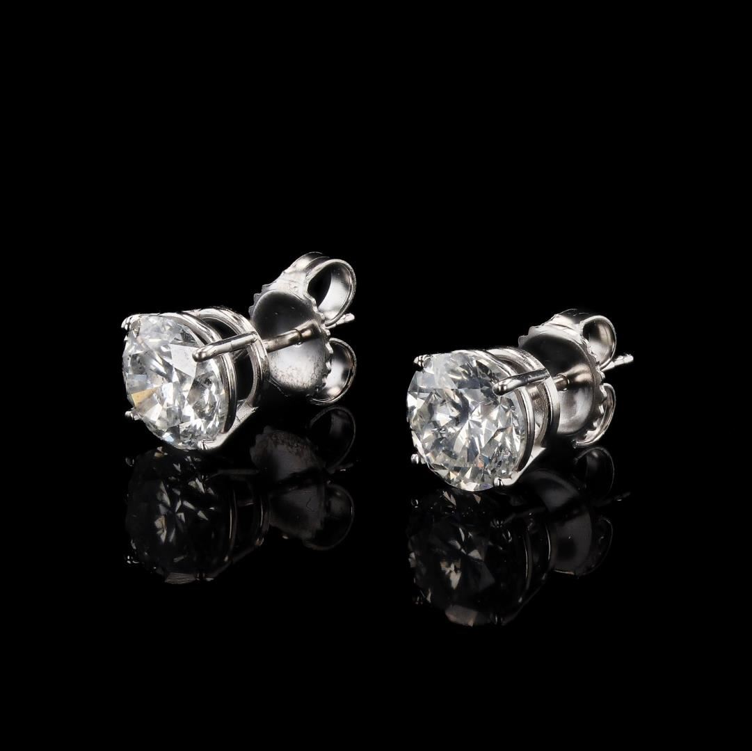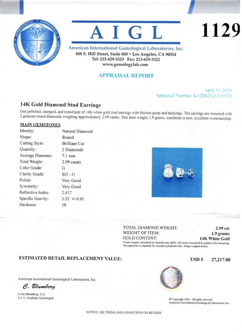 One polished. stamped. and tested pair of 14K white gold stud earrings with friction posts and backings. The earrings are mounted with 2 genuine round diamonds weighing approximately 2.99 carats. This item weighs 1.9 grams, condition is new. excellent workmanship. #MAIN GEMSTONES# Identity: Natural Diamond Shape: Round Cutting Style: Brilliant Cut Quantity: 2 Diamonds Average Diameter: 7.1mm Total Weight: 2.99 carats Color Grade: G Clarity Grade: SI3-I1 Polish: Very Good Symmetry: Very Good Refractive Index: 2.417 Specific Gravity: 3.52 +/-0.01 Hardness: 10 TOTAL DIAMOND WEIGHT: 2.99 cts WEIGHT OF ITEM: 1.9 grams GOLD CONTENT: 14K White Gold #LREF-12625