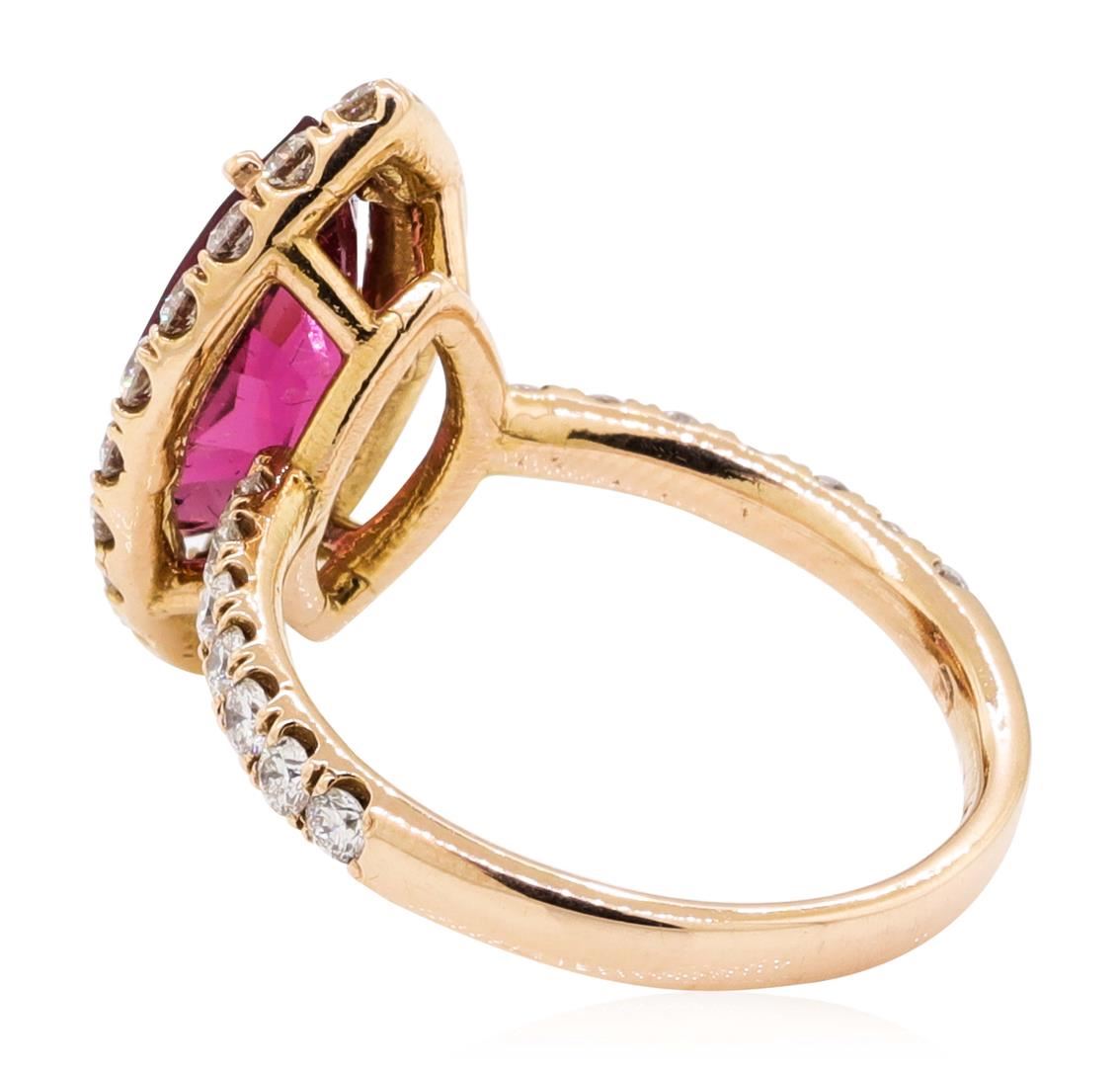 One electronically tested 14KT rose gold lady's cast fashion ring with a halo with a bright polish finish. The featured lady's ring has a shank measuring 2.30 millimeters wide. Identified with markings of '14K'. Condition is new, good workmanship. Containing: One prong set marquise modified brilliant cut natural rubellite, measuring 13.07 x 6.54 x 4.13mm, (depth est.) approximate weight of 2.04ct., clarity is eye clean, medium, moderately strong, orangy red color, (GIA oR 5/4), cut is very good. Transmitting light with no distortion, transparent. Colored gemstones are presumed to have been subjected to commonly used enhancement processes. Graded in the setting. Thirty-Two prong set round brilliant cut diamonds, measuring 2.00 - 1.95 x 1.23mm (depth est.) approximate total weight of 32 Stones = 0.95ct. Graded in the setting. Color H - I Clarity SI-1 to SI-2 Cut Good. Total Weight of Colored Stones 2.04ct.. Total Weight of Diamonds 0.95ct.. Total Weight of Ring 4.00gm GAS Appraised at $4115.00. GAS Appraised.