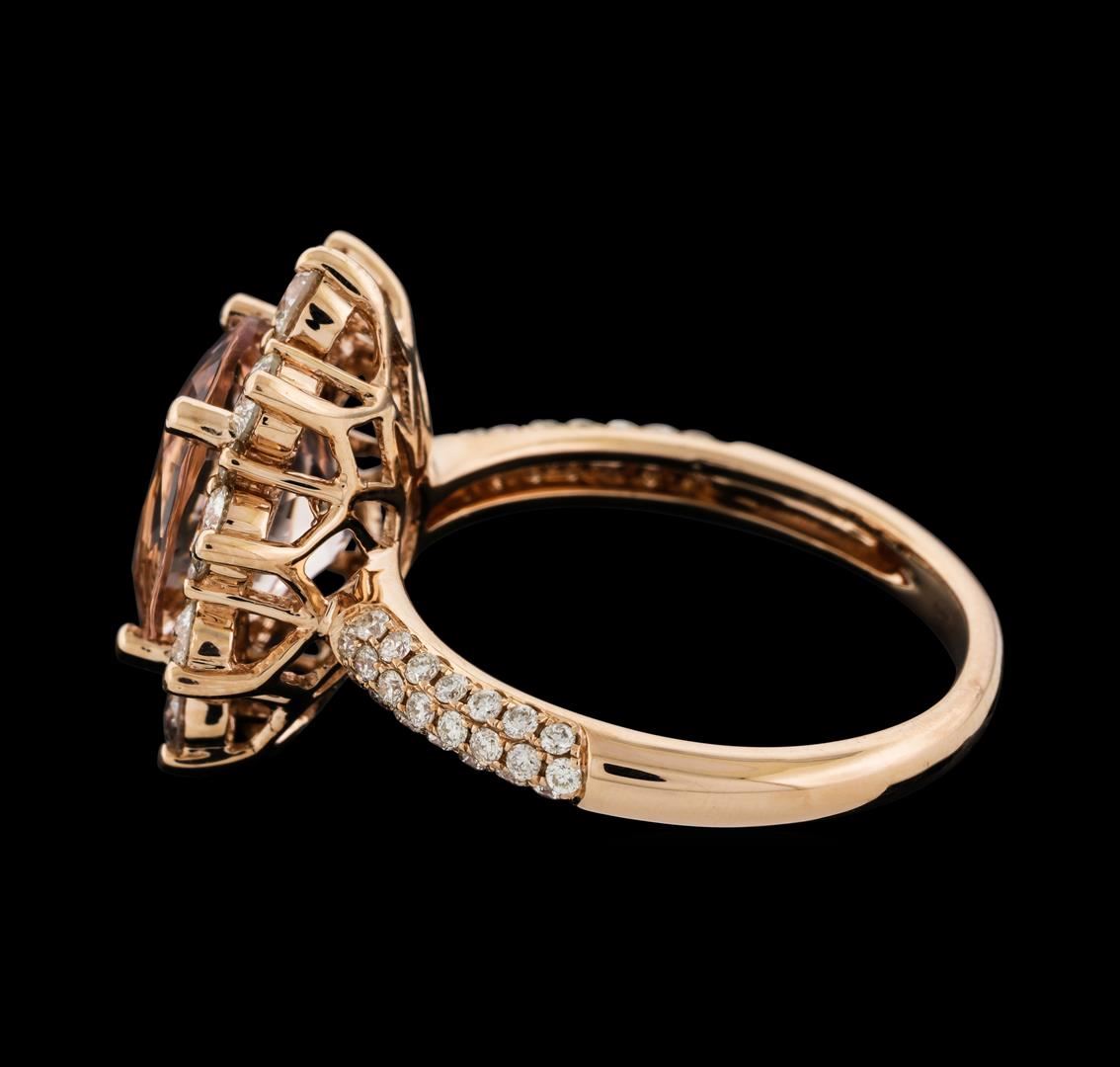 One electronically tested 14KT rose gold lady's cast fashion starburst motif ring with a scalloped basket halo with a bright polish finish. The featured lady's ring has a shank measuring 2.22 millimeters wide. Identified with markings of '14K'. Condition is new, good workmanship. Containing: One prong set oval modified brilliant cut natural morganite, measuring 10.78 x 8.76 x 5.93mm, (depth est.) approximate weight of 2.99ct., clarity is eye clean, light, moderately strong, reddish orange color, (GIA rO 3/4), cut is very good. Transmitting light with no distortion, transparent. Colored gemstones are presumed to have been subjected to commonly used enhancement processes. Graded in the setting. Ten prong set round brilliant cut diamonds, measuring 2.80 - 2.75 x 1.72mm (depth est.) approximate total weight of 10 Stones = 0.83ct. Graded in the setting. Clarity SI-1 to SI-2. Color: G - H Cut Very Good Ten prong set round brilliant cut diamonds, measuring 1.40 - 1.35 x 0.86mm (depth est.) approximate total weight of 10 Stones = 0.10ct. Graded in the setting. Clarity SI-1 to SI-2. Color: H - I Cut Good Forty-Four prong set round brilliant cut diamonds, measuring 1.10 - 1.05 x 0.67mm (depth est.) approximate total weight of 44 Stones = 0.21ct. Graded in the setting. Clarity SI-1 to SI-2. Color: G - H Cut Good. Total Weight of Colored Stones 2.99ct.. Total Weight of Diamonds 1.14ct.. Total Weight of Ring 4.70gm. GAS Appraised at $5,125.00.