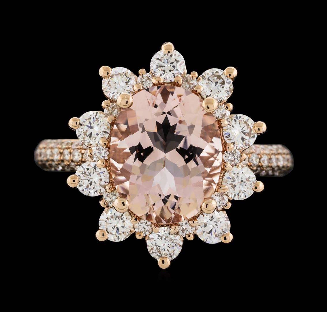 One electronically tested 14KT rose gold lady's cast fashion starburst motif ring with a scalloped basket halo with a bright polish finish. The featured lady's ring has a shank measuring 2.22 millimeters wide. Identified with markings of '14K'. Condition is new, good workmanship. Containing: One prong set oval modified brilliant cut natural morganite, measuring 10.78 x 8.76 x 5.93mm, (depth est.) approximate weight of 2.99ct., clarity is eye clean, light, moderately strong, reddish orange color, (GIA rO 3/4), cut is very good. Transmitting light with no distortion, transparent. Colored gemstones are presumed to have been subjected to commonly used enhancement processes. Graded in the setting. Ten prong set round brilliant cut diamonds, measuring 2.80 - 2.75 x 1.72mm (depth est.) approximate total weight of 10 Stones = 0.83ct. Graded in the setting. Clarity SI-1 to SI-2. Color: G - H Cut Very Good Ten prong set round brilliant cut diamonds, measuring 1.40 - 1.35 x 0.86mm (depth est.) approximate total weight of 10 Stones = 0.10ct. Graded in the setting. Clarity SI-1 to SI-2. Color: H - I Cut Good Forty-Four prong set round brilliant cut diamonds, measuring 1.10 - 1.05 x 0.67mm (depth est.) approximate total weight of 44 Stones = 0.21ct. Graded in the setting. Clarity SI-1 to SI-2. Color: G - H Cut Good. Total Weight of Colored Stones 2.99ct.. Total Weight of Diamonds 1.14ct.. Total Weight of Ring 4.70gm. GAS Appraised at $5,125.00.