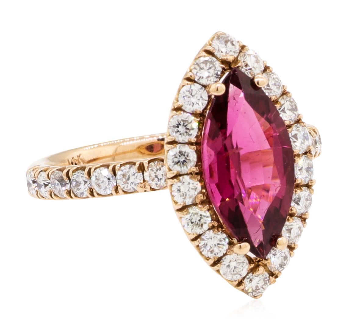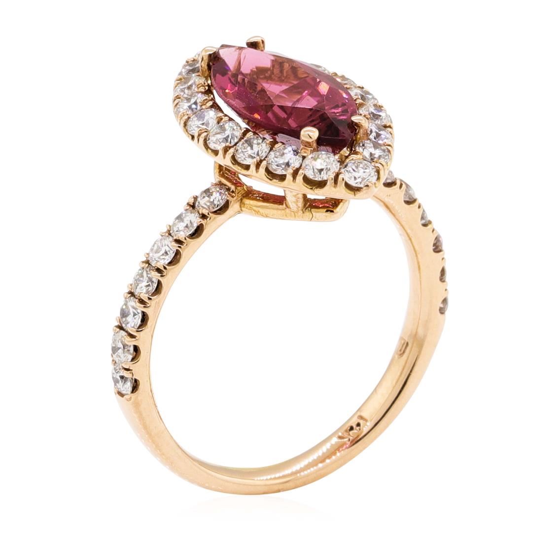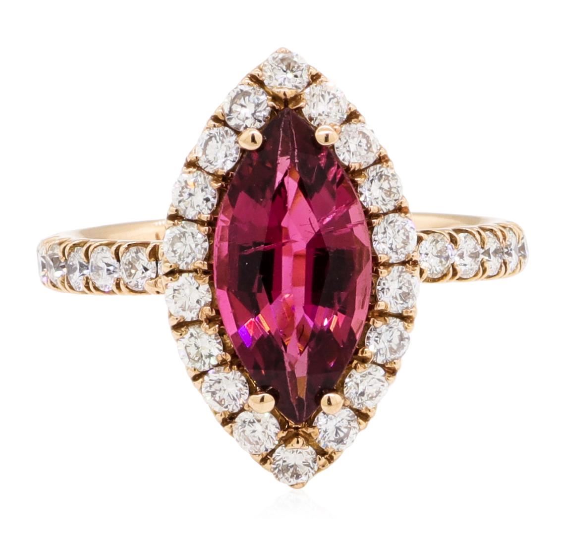 One electronically tested 14KT rose gold lady's cast fashion ring with a halo with a bright polish finish. The featured lady's ring has a shank measuring 2.30 millimeters wide. Identified with markings of '14K'. Condition is new, good workmanship. Containing: One prong set marquise modified brilliant cut natural rubellite, measuring 13.07 x 6.54 x 4.13mm, (depth est.) approximate weight of 2.04ct., clarity is eye clean, medium, moderately strong, orangy red color, (GIA oR 5/4), cut is very good. Transmitting light with no distortion, transparent. Colored gemstones are presumed to have been subjected to commonly used enhancement processes. Graded in the setting. Thirty-Two prong set round brilliant cut diamonds, measuring 2.00 - 1.95 x 1.23mm (depth est.) approximate total weight of 32 Stones = 0.95ct. Graded in the setting. Color H - I Clarity SI-1 to SI-2 Cut Good. Total Weight of Colored Stones 2.04ct.. Total Weight of Diamonds 0.95ct.. Total Weight of Ring 4.00gm GAS Appraised at $4115.00. GAS Appraised at $4,115.00.