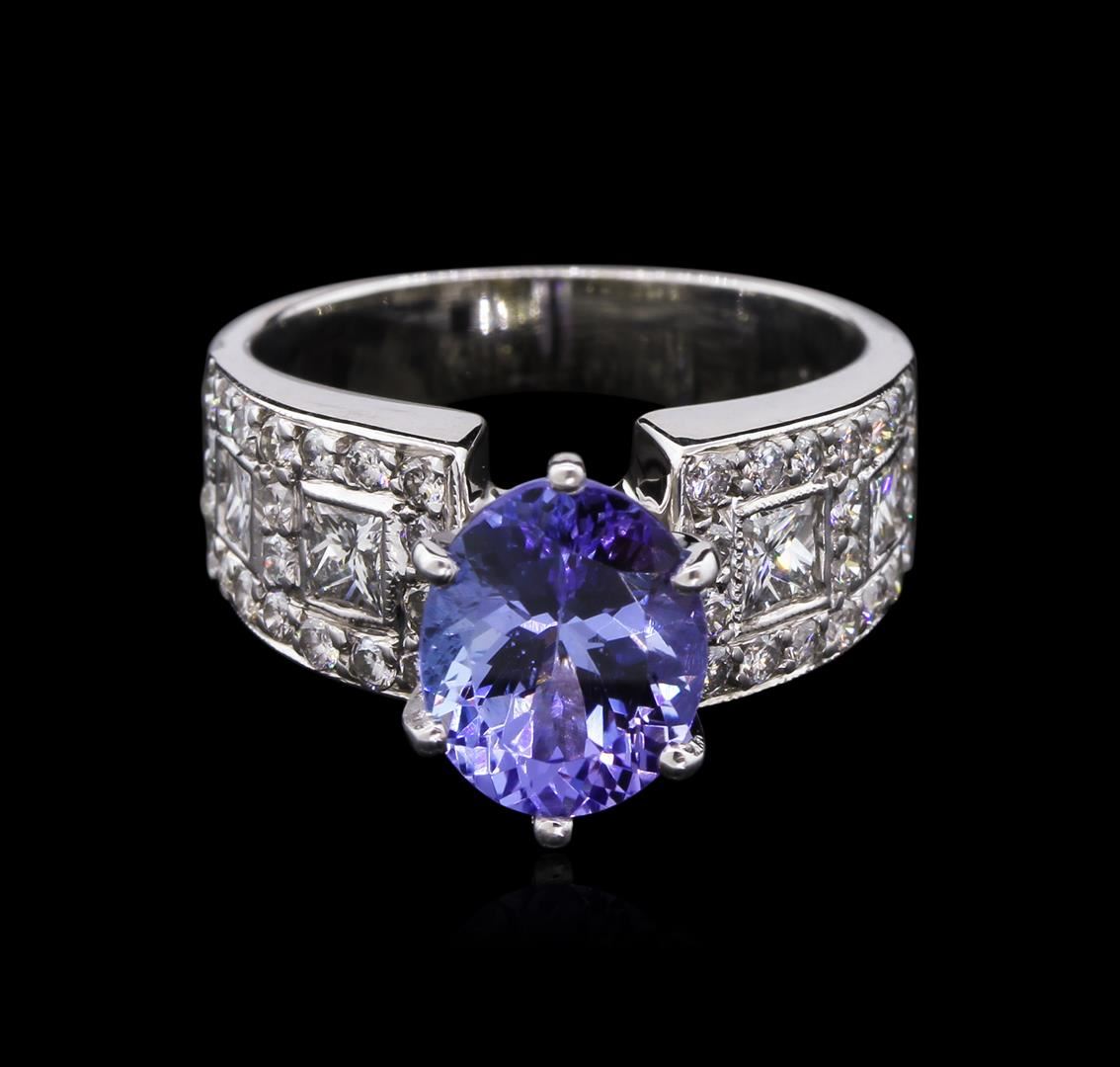 One electronically tested 14KT white gold lady's combination cast & assembled fashion ring with a bright polish with milgrain detailing finish. The featured lady's ring has a shank measuring 4.10 millimeters wide. Identified with markings of "14K". Condition is new, good workmanship. Containing: One prong set oval modified brilliant cut natural tanzanite, measuring 9.80 x 7.90 x 5.45mm, approximate weight of 2.99ct., clarity is eye clean, type I, light, very slightly grayish, violetish blue color, (GIA vB 3/3), cut is very good. Colored gemstones are presumed to have been subjected to commonly used enhancement processes. Graded in the setting. Two bezel set princess cut diamonds, measuring 3.10 x 3.00 x 2.25mm (depth est.) approximate total weight of 2 Stones = 0.33ct. Graded in the setting. Clarity: VS-1 to VS-2. Color: H - I. Cut Very Good Two bezel set princess cut diamonds, measuring 2.85 x 2.75 x 2.06mm (depth est.) approximate total weight of 2 Stones = 0.23ct. Graded in the setting. Clarity: VS-1 to VS-2. Color: H - I. Cut Good Forty prong set round brilliant cut diamonds, measuring 1.50 - 1.40 x 0.87mm (depth est.) approximate total weight of 40 Stones = 0.44ct. Graded in the setting. Clarity: SI-1 to I-1. Color: H - I. Cut Good. Total Weight of Colored Stones 2.99ct. Total Weight of Diamonds 1.00ct. Total Weight of Ring 7.60gm GAS Appraised at $6,395.00.