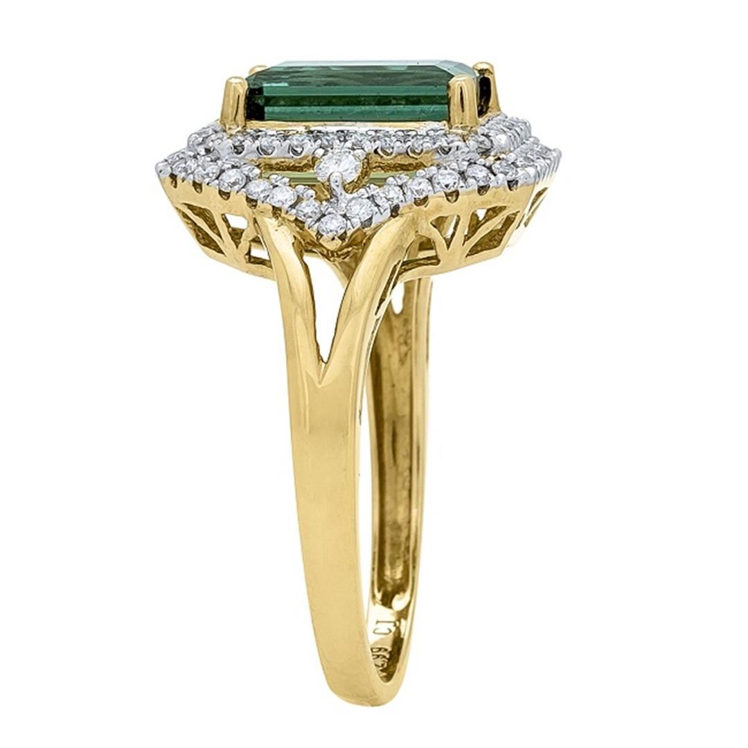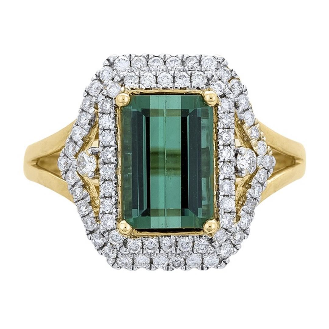 One Tourmaline and Diamond Ring featuring: 14KT Yellow Gold with a total weight of 3.92 grams, Tourmaline with a total weight of 2.99ct, and 70 Diamonds with a total weight of 0.46ctw.
