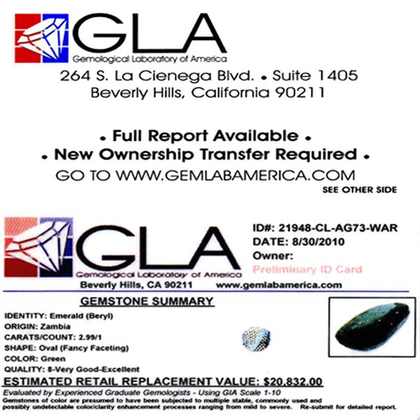 Excellent green colored specimen oval cut; lab quality evaluation 8; treatment as noted; Gem Guide wholesale $2990-$4485; full retail appraisal $20832; full lab evaluation available