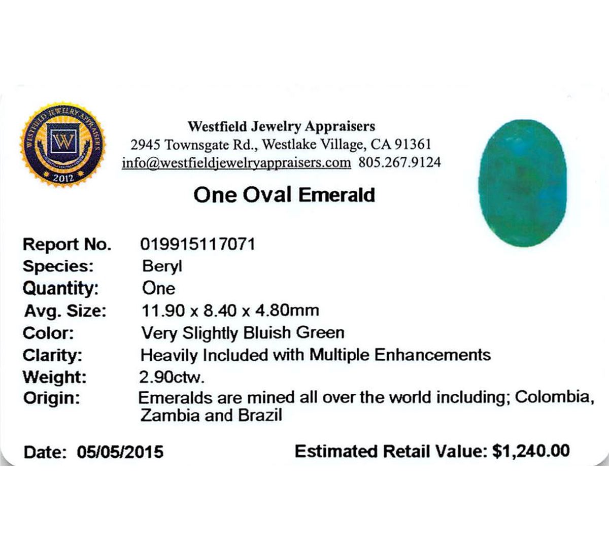 One oval mixed cut natural emerald, measuring 11.90 x 8.40 x 4.80mm, approximate weight of 2.90ct., clarity is heavily included, type III, medium dark, very slightly grayish, very slightly bluish green color, (GIA vslbG 6/3), cut is good. Indications of multiple laboratory enhancements, including high temperature heat treatment. Westfield Appraised at $1,240.00.