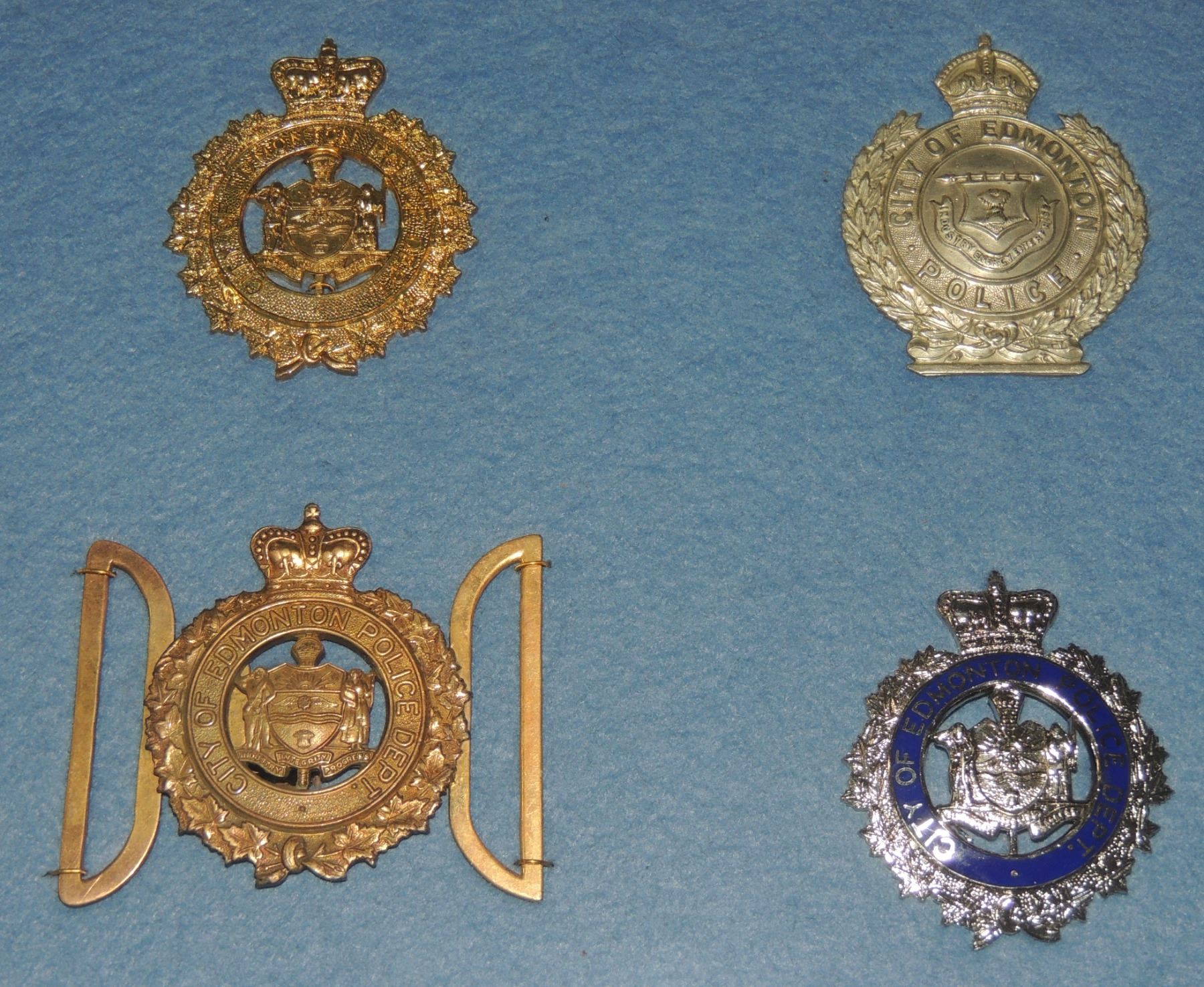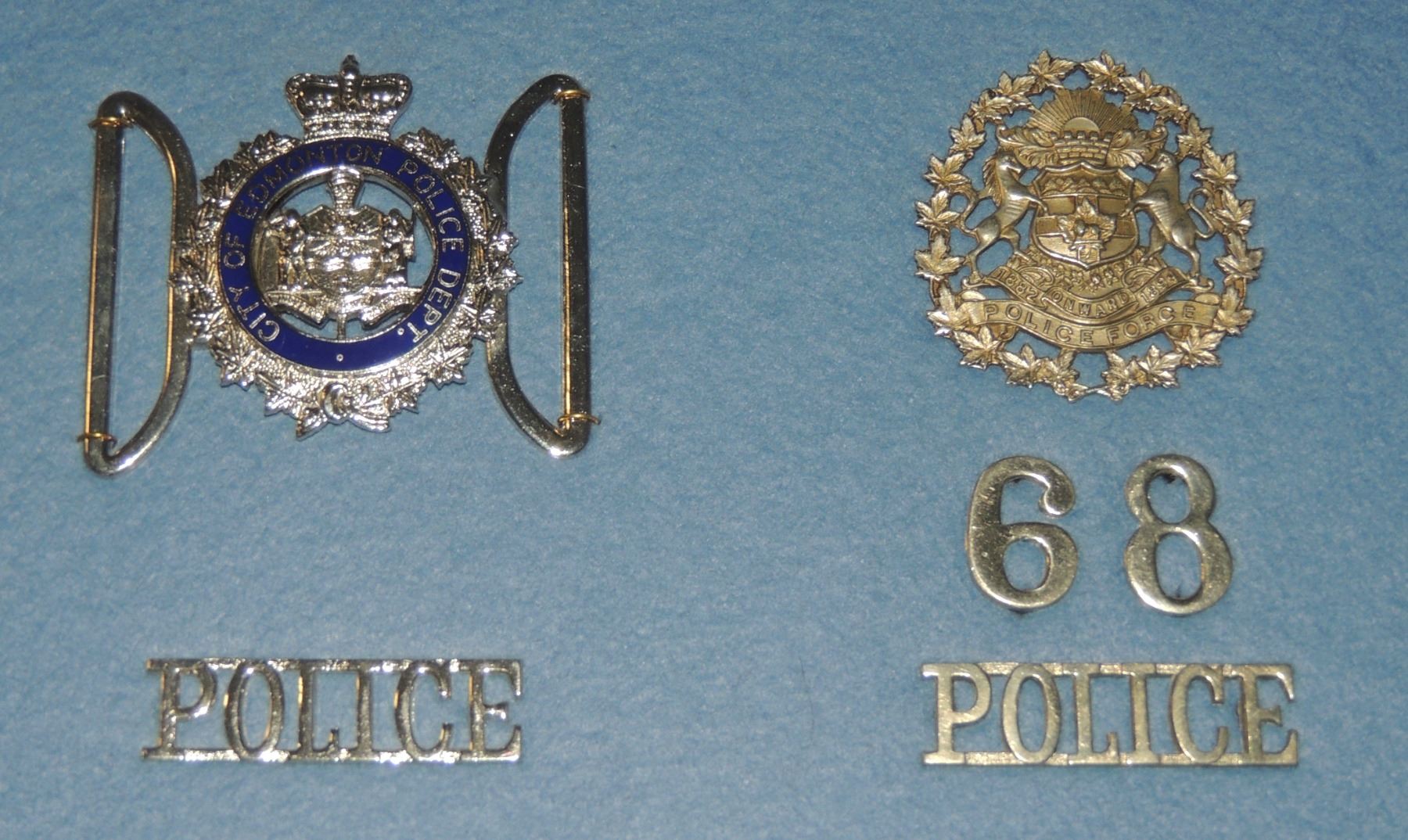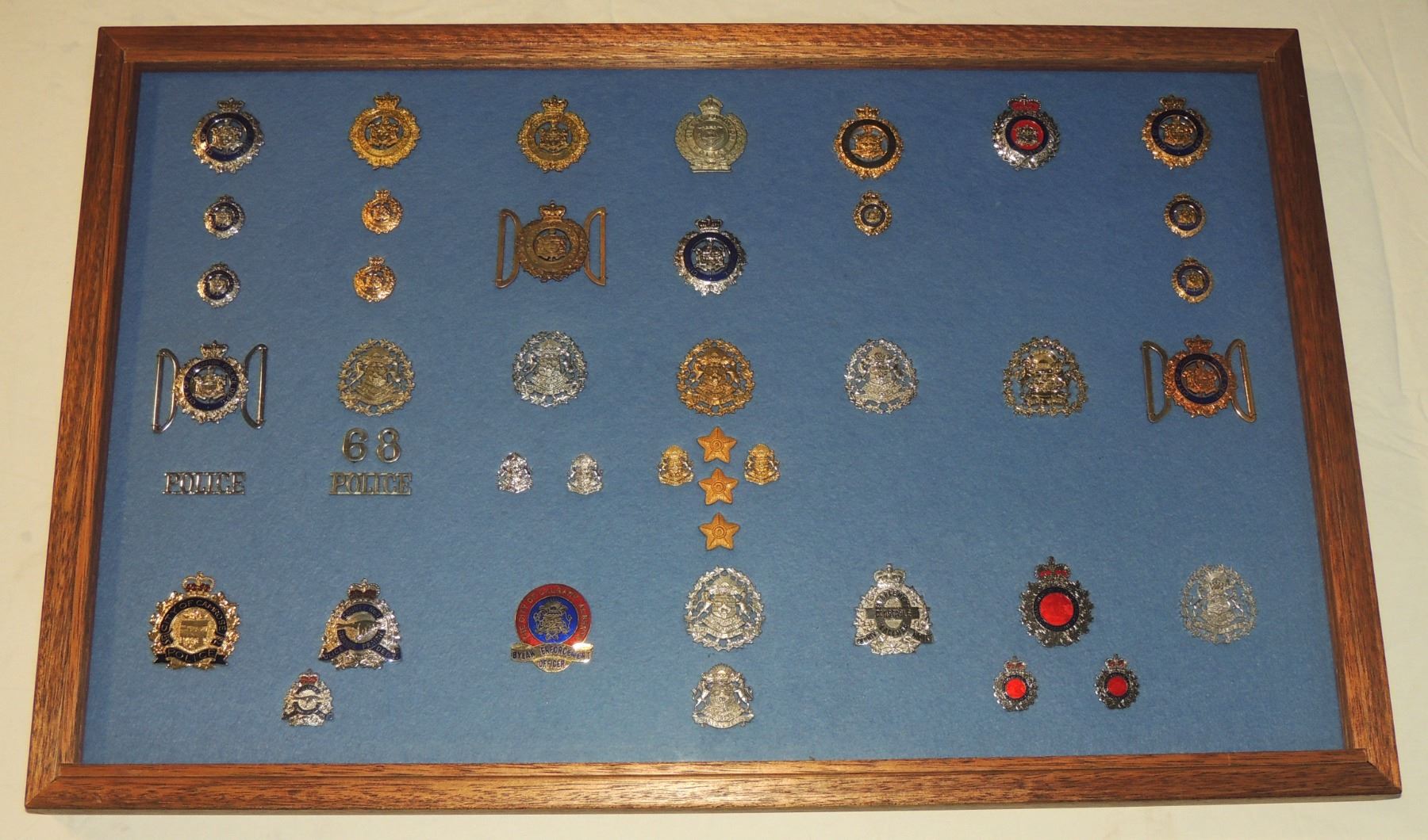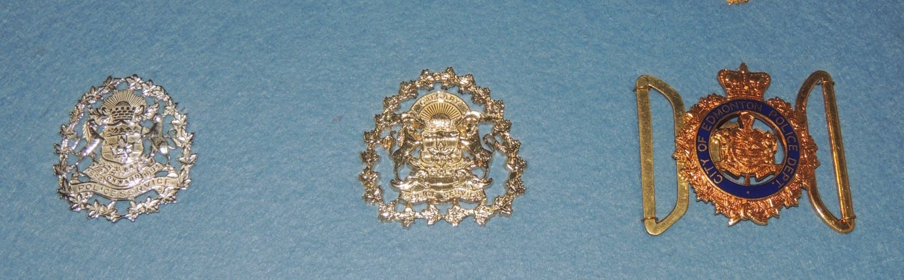 FRAMED CAP BADGE COLLAR SET INCLUDING CALGARY POLICE EDMONTON POLICE CAMROSE POLICE GRANDE PRAIRIE LACOMBE BRAZEAU INCLUDING BELT BUCKLES, RARE BADGE VARIATIONS AND MORE