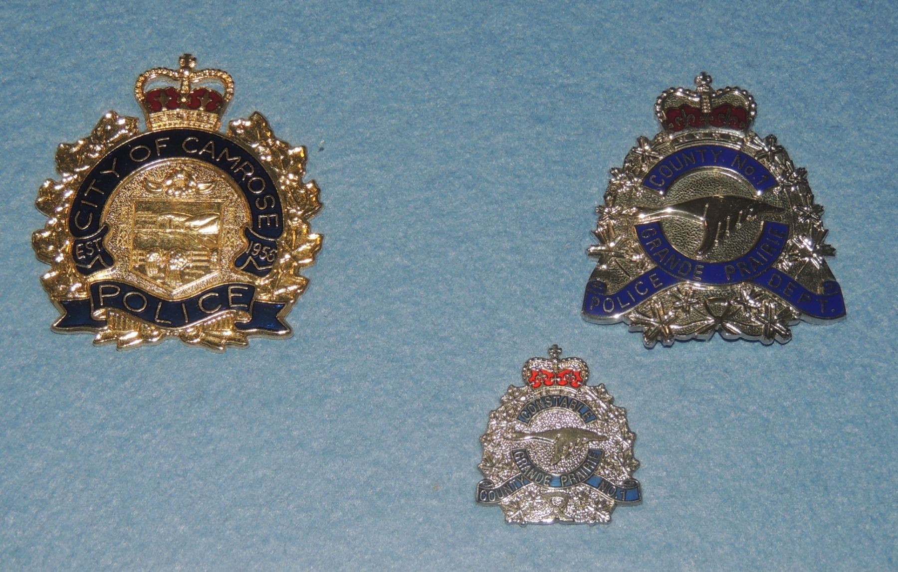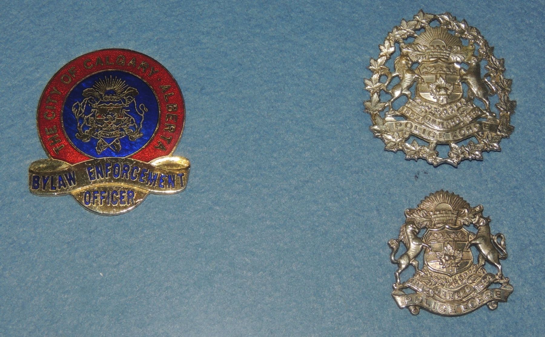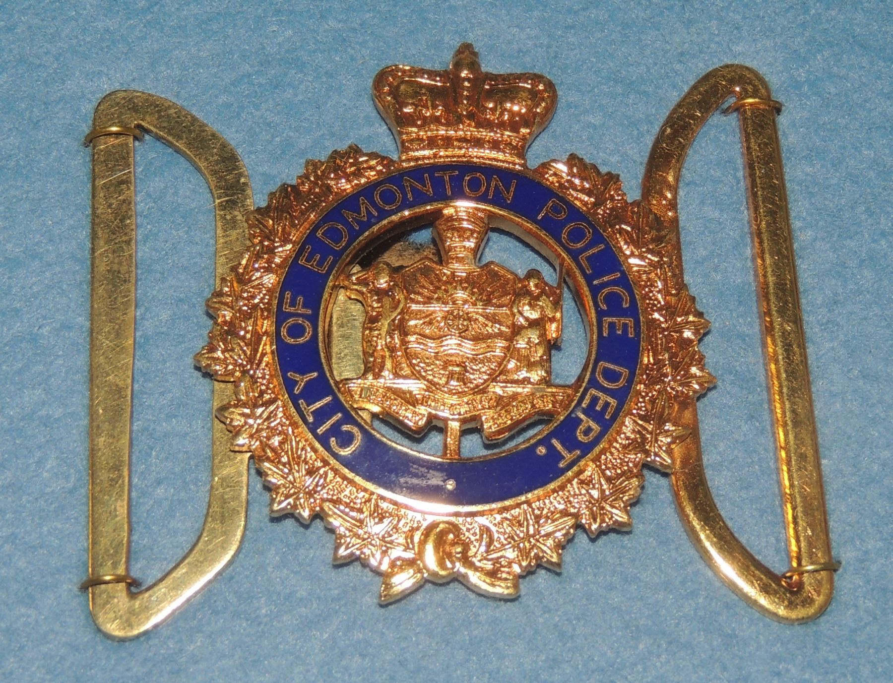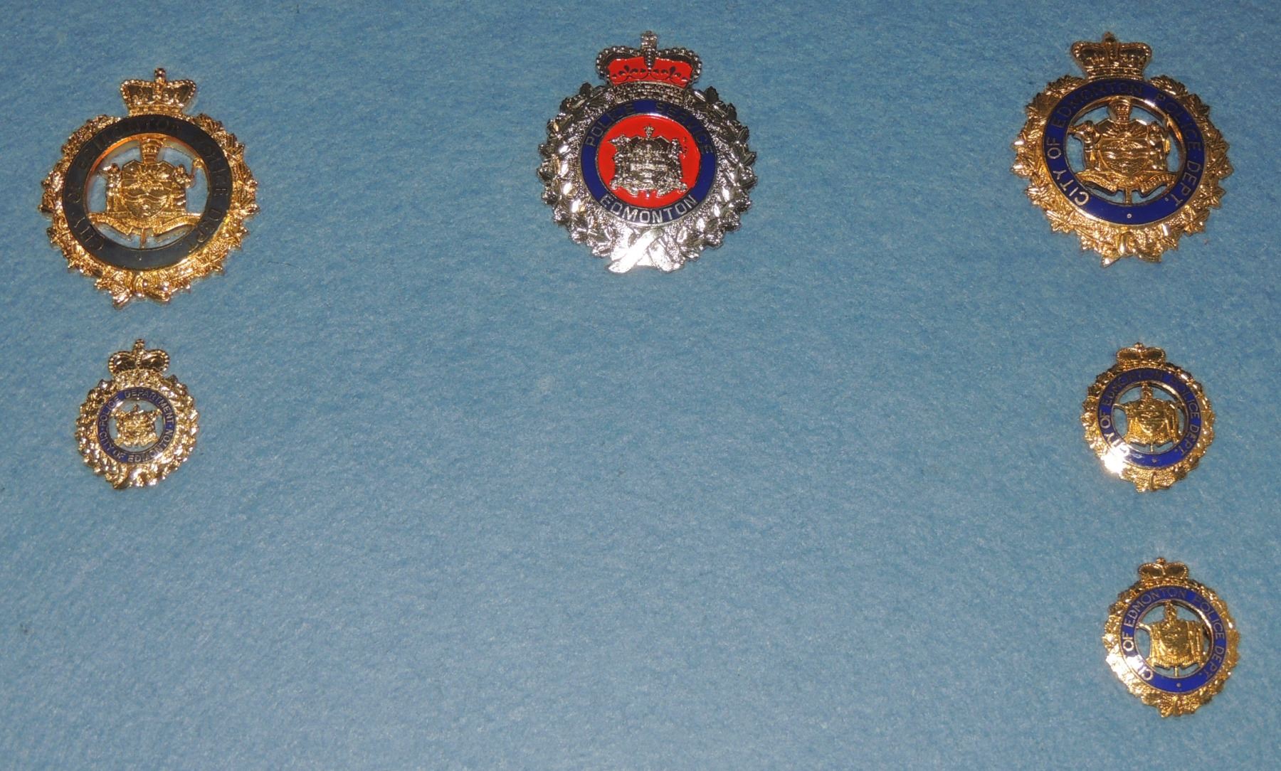 FRAMED CAP BADGE COLLAR SET INCLUDING CALGARY POLICE EDMONTON POLICE CAMROSE POLICE GRANDE PRAIRIE LACOMBE BRAZEAU INCLUDING BELT BUCKLES, RARE BADGE VARIATIONS AND MORE